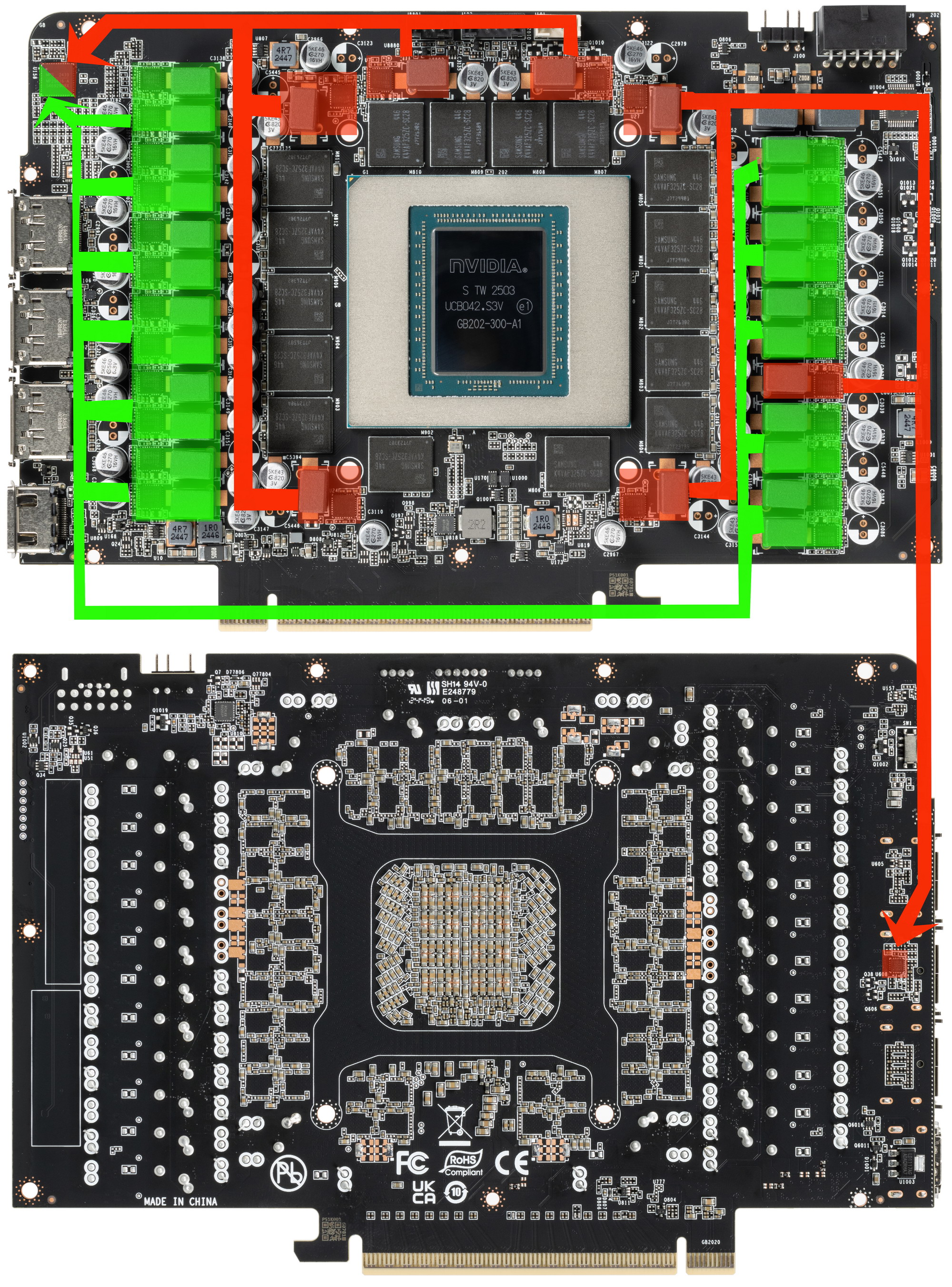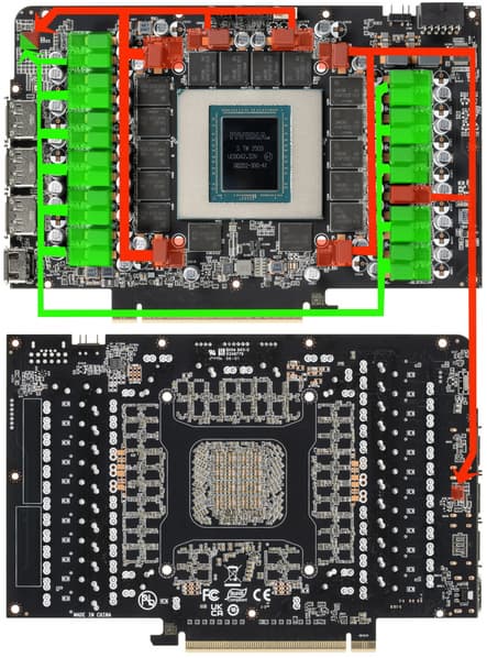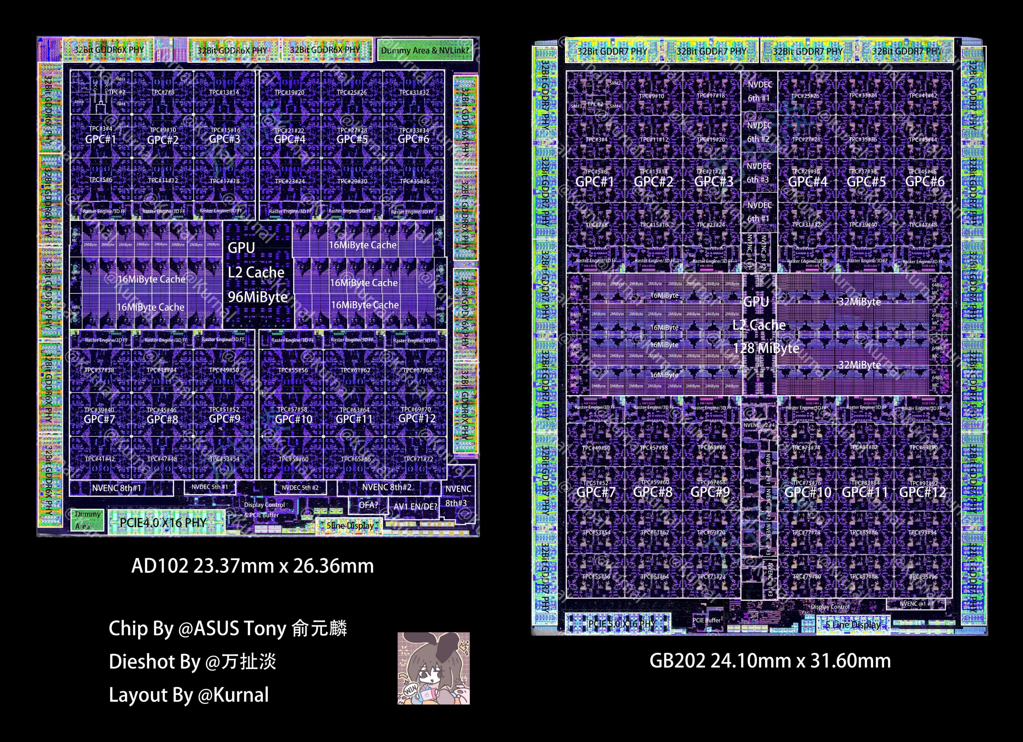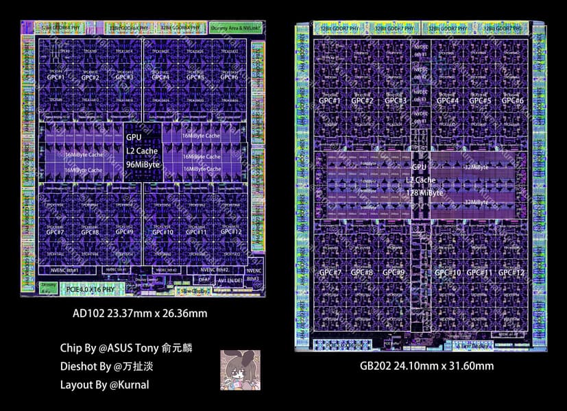 Снимок и общая схема кристалла GB202 была опубликована исследователем Kurnal на X.com, который показал на ней примерное расположение основных компонентов графического процессора: GPC, контроллеров памяти, L2-кэша и т. д. — в сравнении с AD102, используемым в GeForce RTX 4090, флагмане предыдущего поколения. По схеме видно, что новый топовый GPU имеет такое же количество кластеров GPC, как у AD102, но количество потоковых мультипроцессоров SM увеличилось, как вырос объем кэш-памяти (в полном чипе) и количество 32-битных контроллеров памяти, которые получили поддержку GDDR7. По площади и количеству транзисторов новый топовый GPU превосходит следующий в линейке чип GB203 примерно вдвое, а по количеству основных исполнительных блоков разница еще больше.