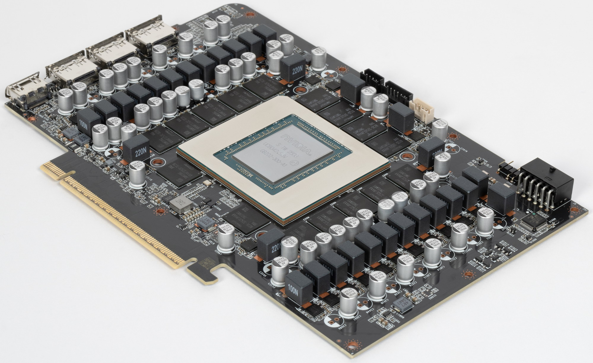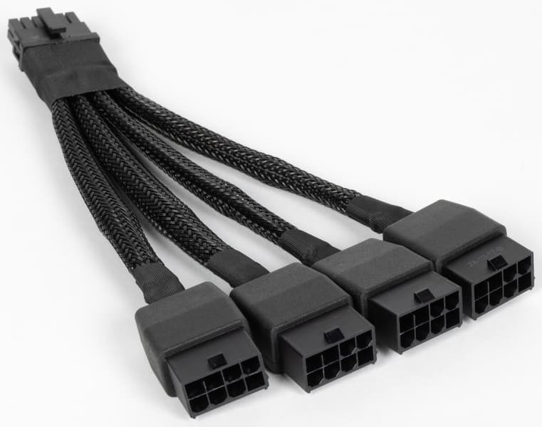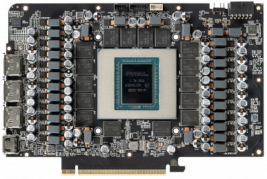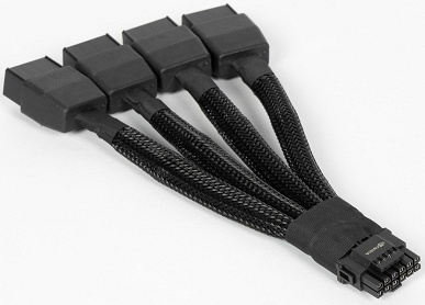 В комплекте Founders Edition поставляется переходник с 8-контактных разъемов на 16-контактный — более новой модификации, которая выполнена качественнее, имеет мягкие кабели и более качественные разъемы. В сочетании 16-контактным разъемом, расположенным на карте под углом, это должно упростить его использование в разных корпусах. Ну а для подключения дисплеев на карте есть три стандартных разъема DisplayPort 2.1b и один HDMI 2.1b.