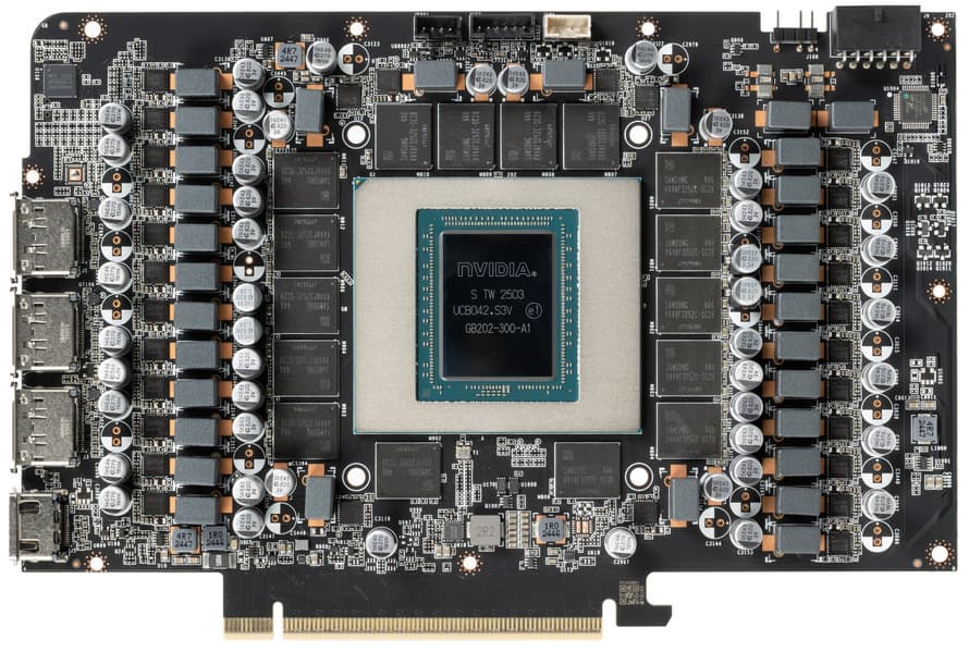 Полная конфигурация GB202 включает 12 кластеров GPC, каждый из которых состоит из восьми TPC и 16 мультипроцессоров SM, так что в целом чип содержит 192 мультипроцессоров SM, каждый содержит 128 CUDA-ядер, поэтому всего в GB202 есть 24756 CUDA-ядер, 192 RT-ядра, 768 тензорных ядер и 768 текстурных блоков TMU. Но модель видеокарты GeForce RTX 5090 использует слегка урезанную версию графического процессора GB202, в котором отключен один кластер GPC, а еще в трех других отключено по одному кластеру TPC. Так что в игровой модификации чипа осталось активными 11 кластеров GPC на 85 кластеров TPC, состоящих из 170 мультипроцессоров SM. То есть, 21760 CUDA-ядер, 170 RT-ядер, 680 тензорных ядер, 680 текстурных блоков TMU и 176 блоков ROP. Был урезан и объем L2-кэша — из 128 МБ в чипе активными остались лишь 96 МБ. В целом же подсистема памяти полного варианта GB202 включает L1-кэш объемом в 24576 КБ, регистровый файл объемом 49152 КБ и L2-кэш объемом 128 МБ.