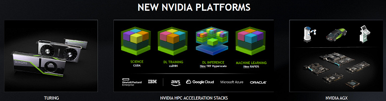 Очень сильно в росте производительности решениям Nvidia помогает внедрение тензорных ядер, предназначенных для решения задач глубокого обучения, тренировке и инференсу нейросетей, умеющих производить вычисления с различной точностью расчетов, а не только общепринятыми 32- или 64-битами. Все новые графические процессоры архитектуры Turing, а также и решения семейства Volta, умеют снижать точность вычислений до 16-, 8- и даже 4-бит, если подобное ухудшение точности расчетов допускается в конкретной задаче.