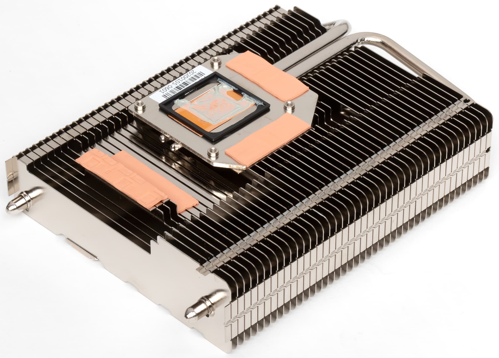 Здесь используется один массивный пластинчатый радиатор, его пересекают две тепловые трубки для улучшения рассеивания тепла по ребрам. Трубки припаяны к медному основанию, которое и прижимается к GPU. Для охлаждения микросхем памяти используется та же самая подошва, а у силовых элементов предусмотрена своя небольшая подошва. В итоге система охлаждения видеокарты укладывается по толщине в 2 слота.