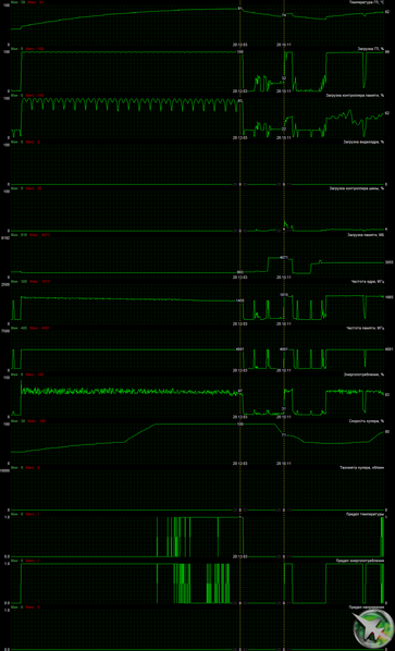 На диаграммах приведены два результата тестирования карты Palit в закрытом корпусе: без продувки и с ней. В первом случае частоты работы ядра лимитировались драйверами Nvidia в зависимости от нагрева GPU, поэтому производительность оказалась чуть-чуть ниже (на 1%-1,5%).
