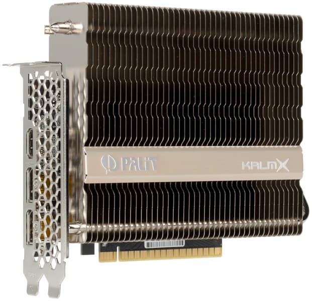 Palit GeForce GTX 1650 KalmX (4 ГБ) — в определенном смысле уникальное решение бюджетного сегмента (эх, совсем недавно еще мы обсуждали видеокарты ценой ниже 10 тысяч рублей, но сейчас это уже невозможно). Производительность у этой карты находится на уровне остальных GTX 1650, а ключевая особенность — пассивная СО, которая имеет как плюсы, так и минусы. Плюс понятен: бесшумность. Минус же заключается в том, что разработчики попытались совместить отсутствие вентиляторов и относительно компактные размеры карты. К сожалению, так не получается: в закрытых корпусах (даже очень большого размера) без хорошей продувки не обойтись, видеокарта может нагреваться до 90 и более градусов. При этом, разумеется, будет страдать не только сама видеокарта, но расположенные рядом компоненты ПК, а производительность снизится в качестве защиты от перегрева. Получается, что карточка с пассивным охлаждением все равно требует активной вентиляции в корпусе, а значит, для создания абсолютно бесшумных систем она не годится. Наверное, можно было пожертвовать компактностью и оснастить карту более массивным радиатором, тогда она работала бы с приемлемым нагревом без необходимости продувать корпус. Тем не менее, Palit GeForce GTX 1650 KalmX все же очень интересна и заслуживает внимания — в конце концов, в львиной доле корпусов сейчас система продувки имеется по умолчанию.
