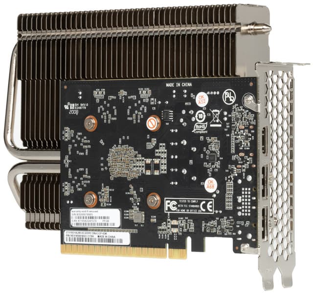 У видеокарты чуть урезан стандартный набор видеовыходов: используются только 2 DP и 1 HDMI, поэтому одновременный вывод изображения возможен на три приемника. Дополнительного питания карта не требует.
