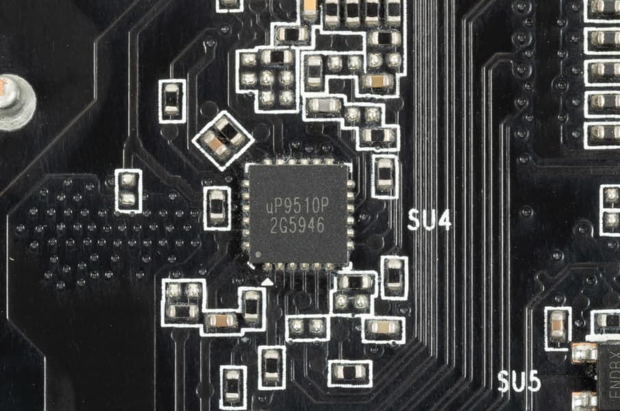 Схема управляется ШИМ-контроллером uP9510 (uPI Semiconductor).