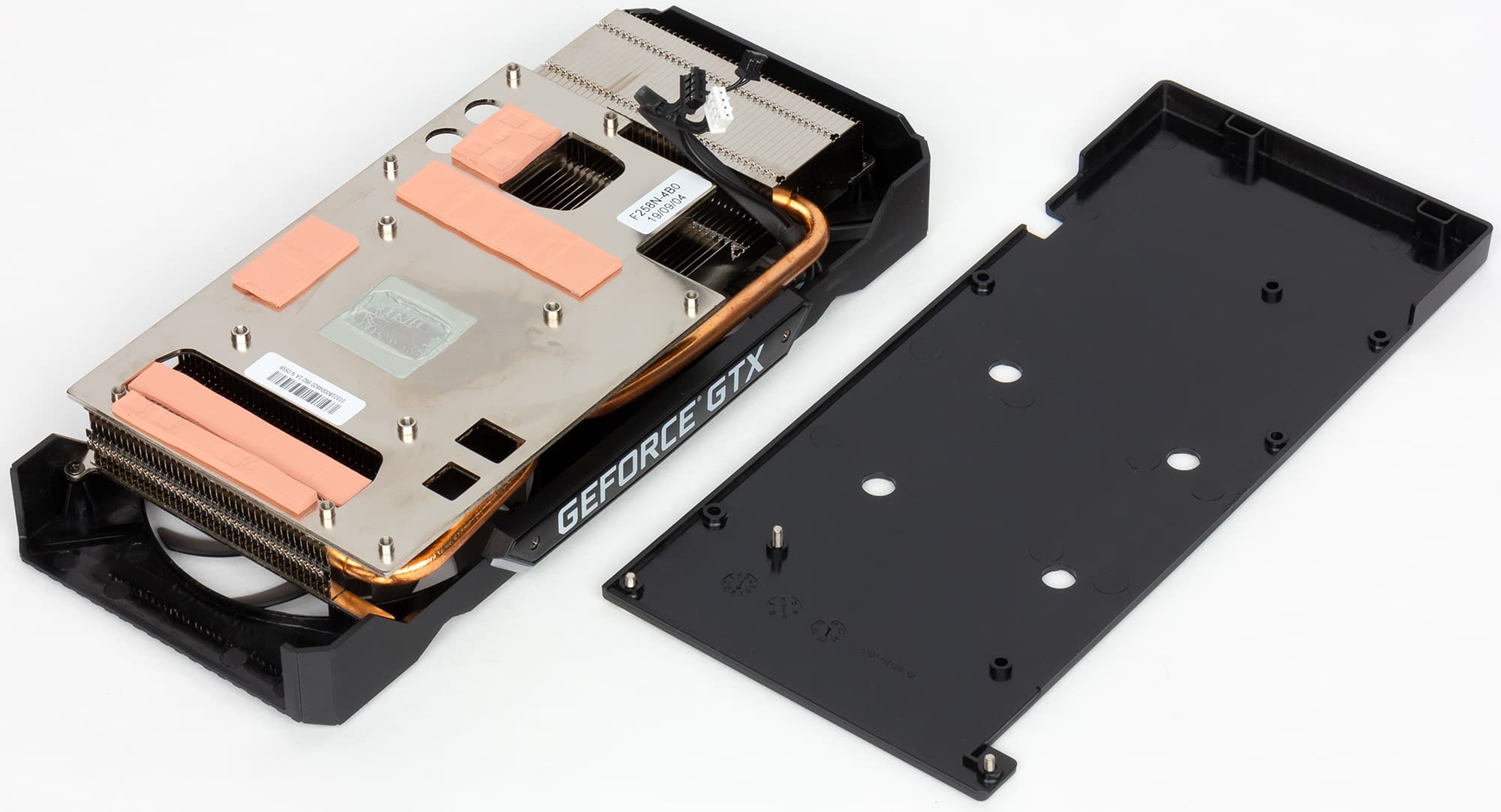 Здесь используется один большой пластинчатый радиатор, его пересекают две тепловые трубки для улучшения разноса тепла по ребрам. Трубки припаяны к основанию, которое и прижимается к GPU. Для охлаждения микросхем памяти и силовых элементов используется то же основание. На обороте карты установлена толстая пластина, служащая исключительно элементом жесткости. В итоге система охлаждения видеокарты укладывается по толщине в 2 слота.