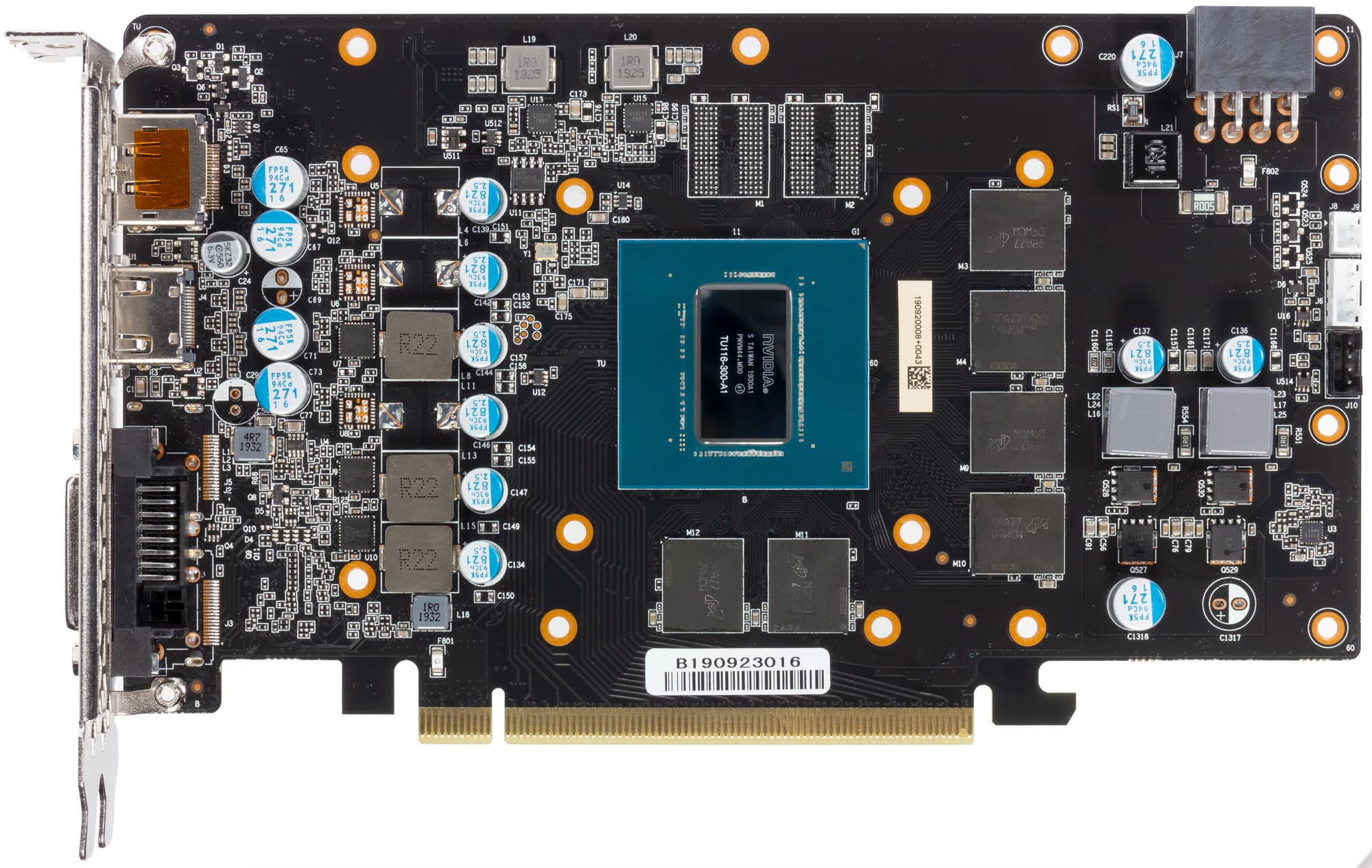 Карта имеет 6 ГБ памяти GDDR6 SDRAM, размещенной в 6 микросхемах по 8 Гбит на лицевой стороне PCB. Микросхемы памяти Micron (GDDR6, MT61K256M32JE-14) рассчитаны на номинальную частоту работы в 3500 (14000) МГц. Расшифровщик кодов на упаковках FBGA находится здесь.