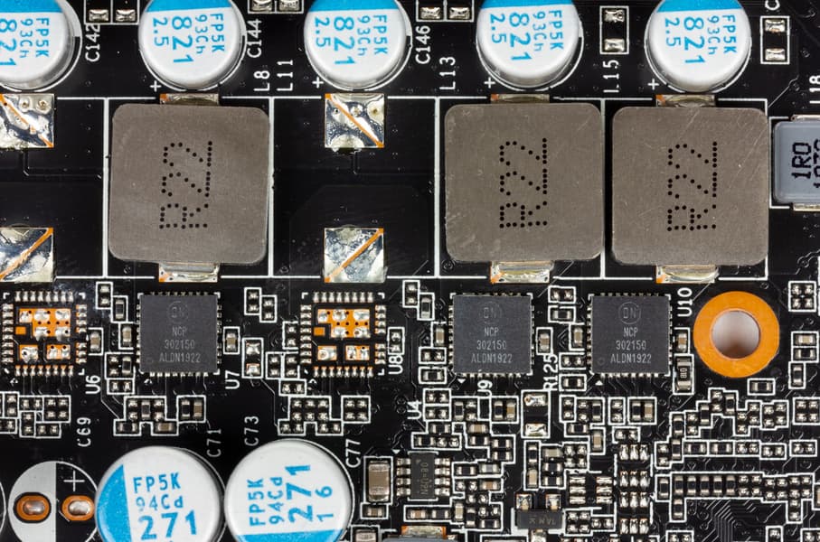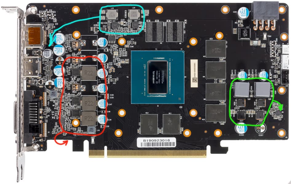 Схема питания ядра (красная) у карты Palit построена на базе 3-фазной схемы, с применением дросселей с ферритовыми сердечниками и мосфетов NCP302150,