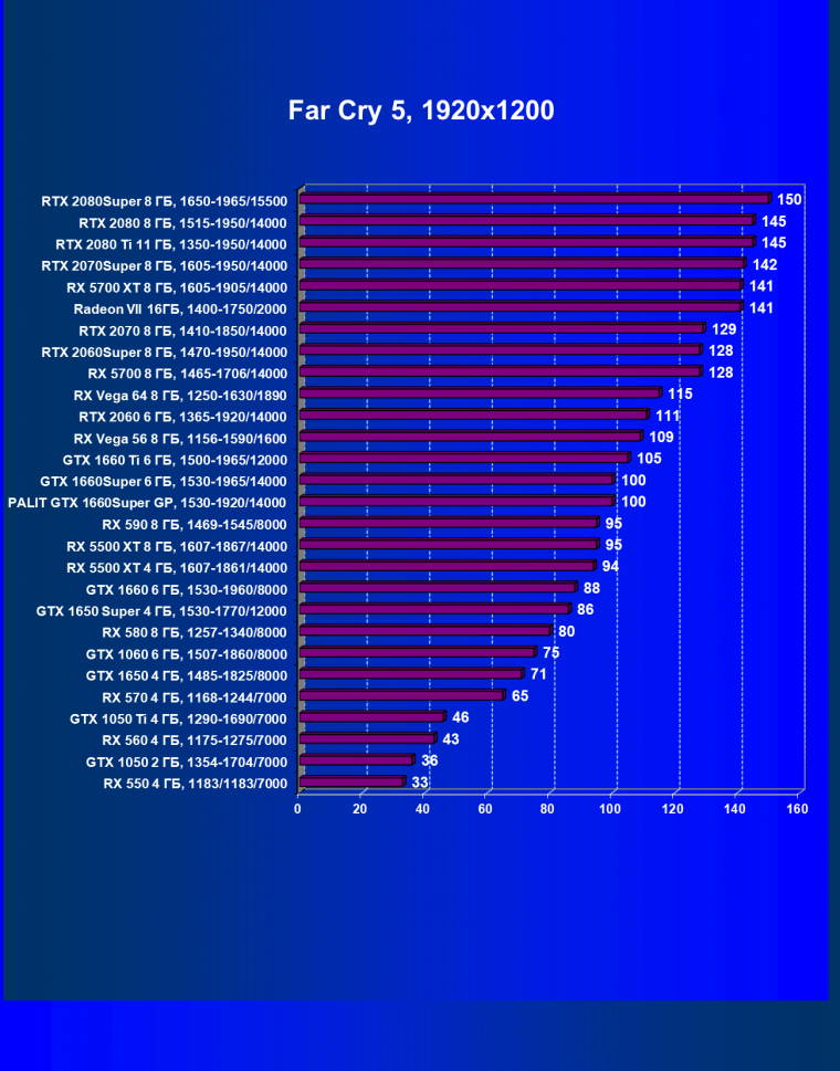 Рейтинг ускорителей iXBT.com демонстрирует нам функциональность видеокарт друг относительно друга и нормирован по самому слабому ускорителю — Radeon RX 550 (то есть сочетание скорости и функций RX 550 приняты за 100%). Рейтинги ведутся по 28 ежемесячно исследуемым нами акселераторам в рамках проекта Лучшая видеокарта месяца. Из общего списка выбирается группа карт для анализа, куда входят GTX 1660 Super и его конкуренты.