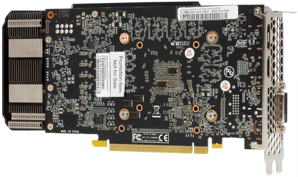 Хорошо видно, что печатная плата у данной карты мало чем отличается от референс-дизайна. Это понятно: рассматриваемая карта Palit нацелена на простых геймеров без особых запросов, не для разгона (и уж точно не для рекордов разгона).