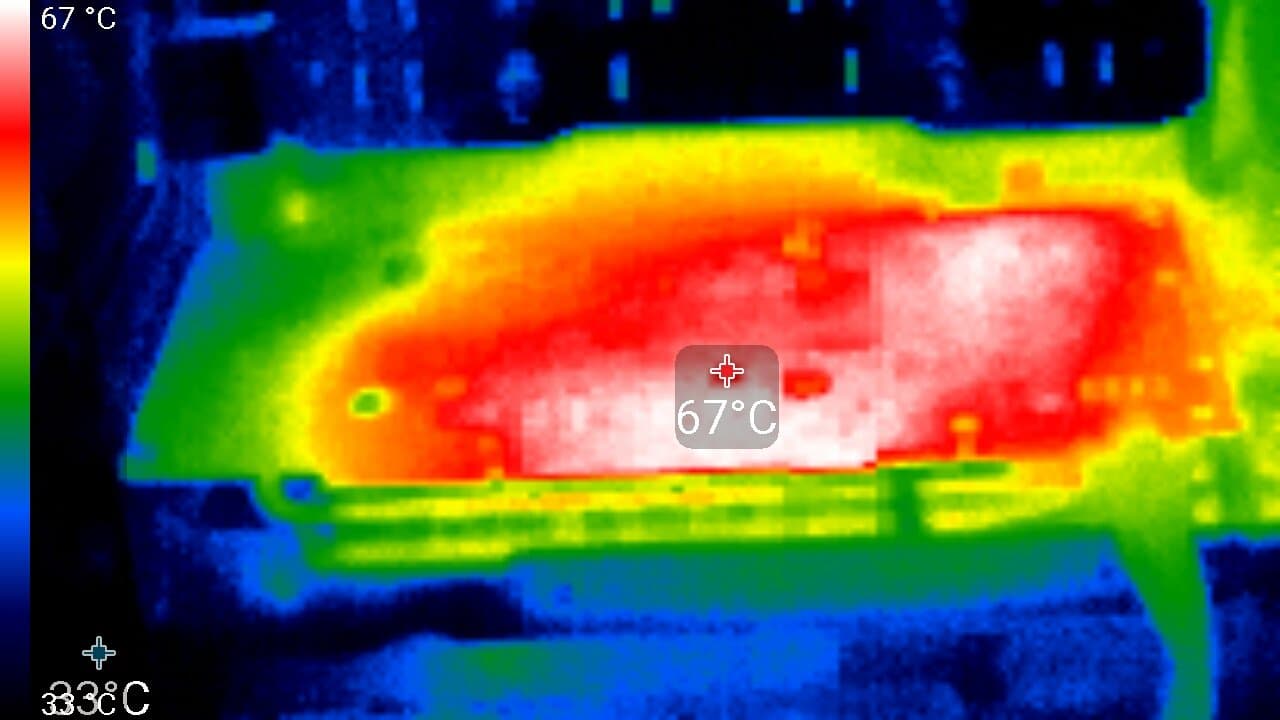Максимальный нагрев — верхний край оборотной стороны PCB.