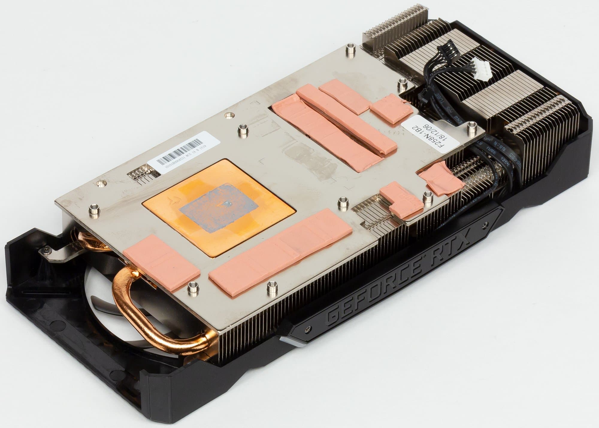 Перед нами односекционный радиатор пластинчатого типа с 4-мя тепловыми трубками. На подошве основного радиатора имеется медная пластина для GPU и термоинтерфейс для охлаждения микросхем памяти и силовых элементов конвертера питания.