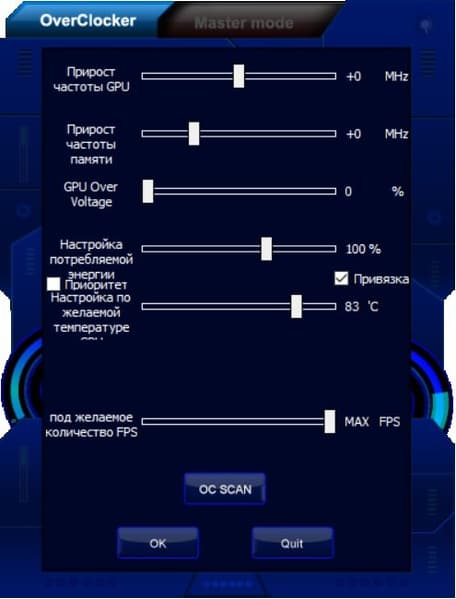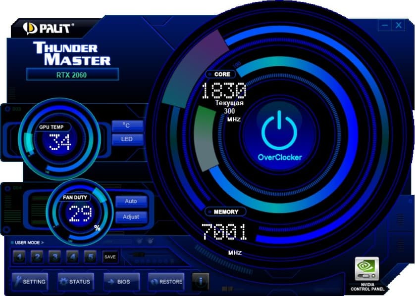 Управление работой карты обеспечивается с помощью фирменной утилиты Palit ThunderMaster, но надо заметить, что ускоритель Palit GeForce RTX 2060 GamingPro не позиционируется для оверклокеров, хотя и немного разогнан в фабричных условиях.