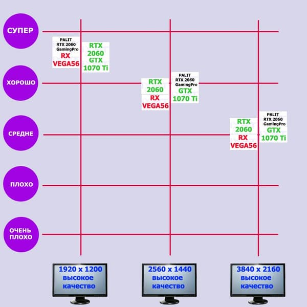 В целом GeForce RTX 2060 отлично подходит для разрешений до Full HD включительно при максимальных настройках качества графики во всех играх. Более того, в ряде игр производительность будет достаточно высокой и в разрешении 2.5К без снижения настроек качества графики, хотя для такого разрешения больше подходит GeForce RTX 2070.