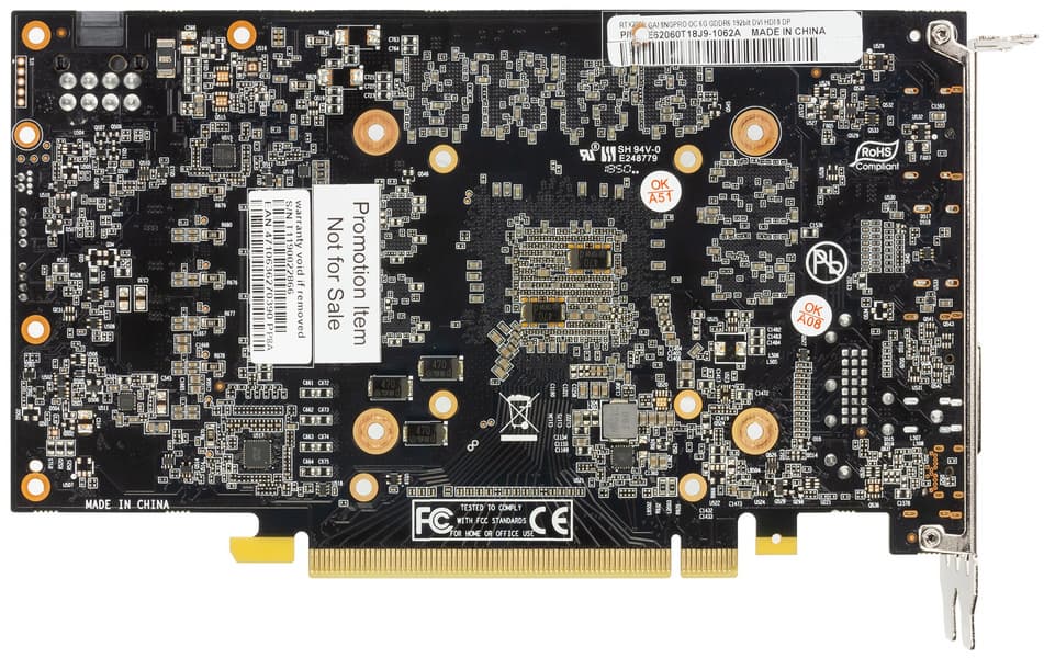 Карта имеет 6 ГБ памяти GDDR6 SDRAM, размещенной в 6 микросхемах по 8 Гбит на лицевой стороне PCB. Микросхемы памяти Micron (GDDR6) рассчитаны на номинальную частоту работы в 3500 (14000) МГц