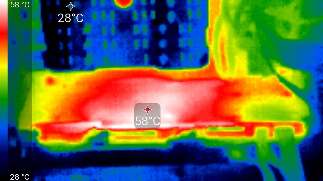 Максимальный нагрев — области около GPU, преобразователей питания и около верхнего края.