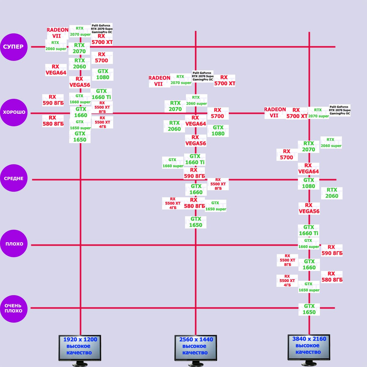 Наши многочисленные исследования показали, что Nvidia GeForce RTX 2070 тянет большинство игр при максимальных настройках качества в разрешениях до 2.5К включительно, а стоящий на уровень выше GeForce RTX 2080 отлично чувствует себя в 2560×1440 и может «замахнуться» на 4К при максимальном качестве графики в ряде игр. «Вклинившийся» между ними GeForce RTX 2070 Super тоже отлично подходит для разрешения 2.5К, но чтобы комфортно играть в 4К, во многих играх со сложной графикой, возможно, придется ухудшать качество — либо вернуться в 2.5К ради сохранения максимального качества графики.