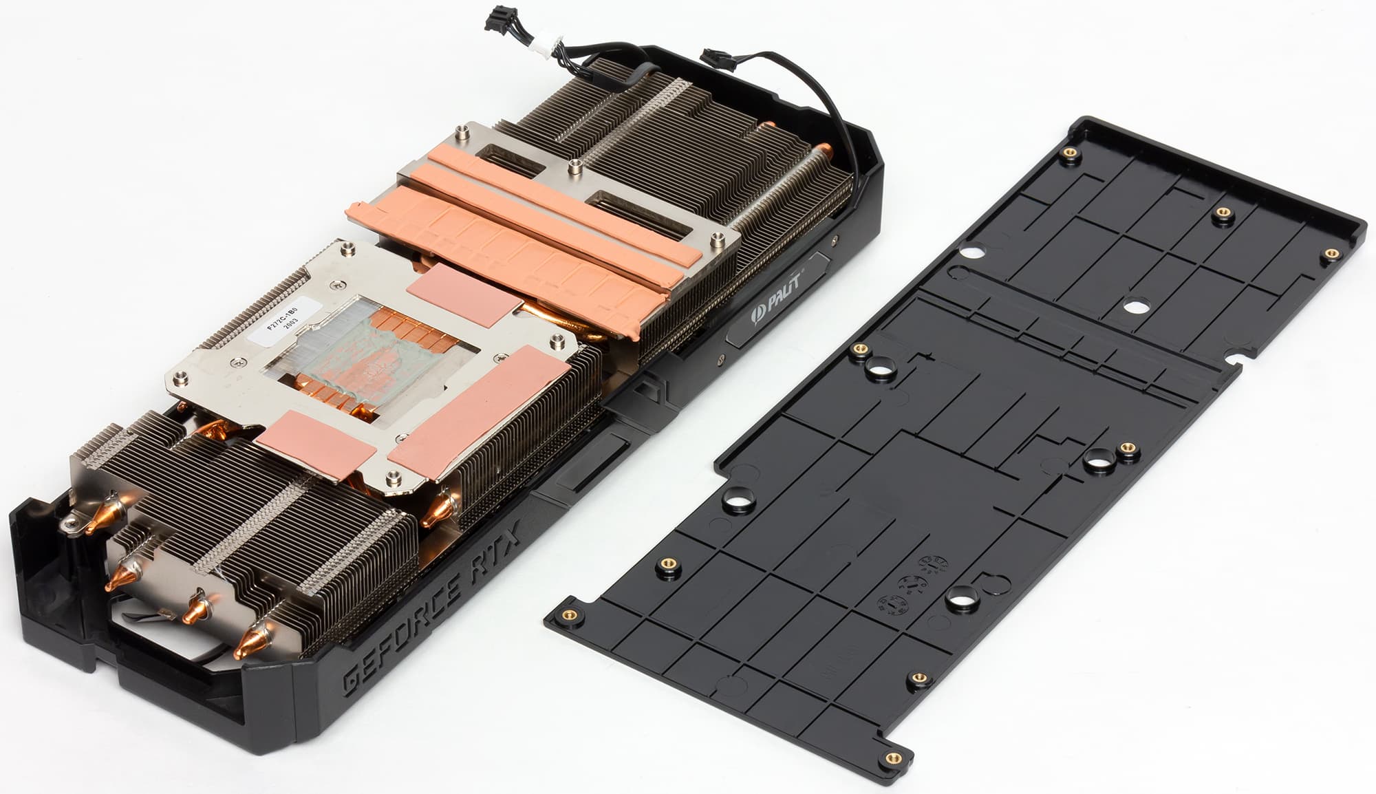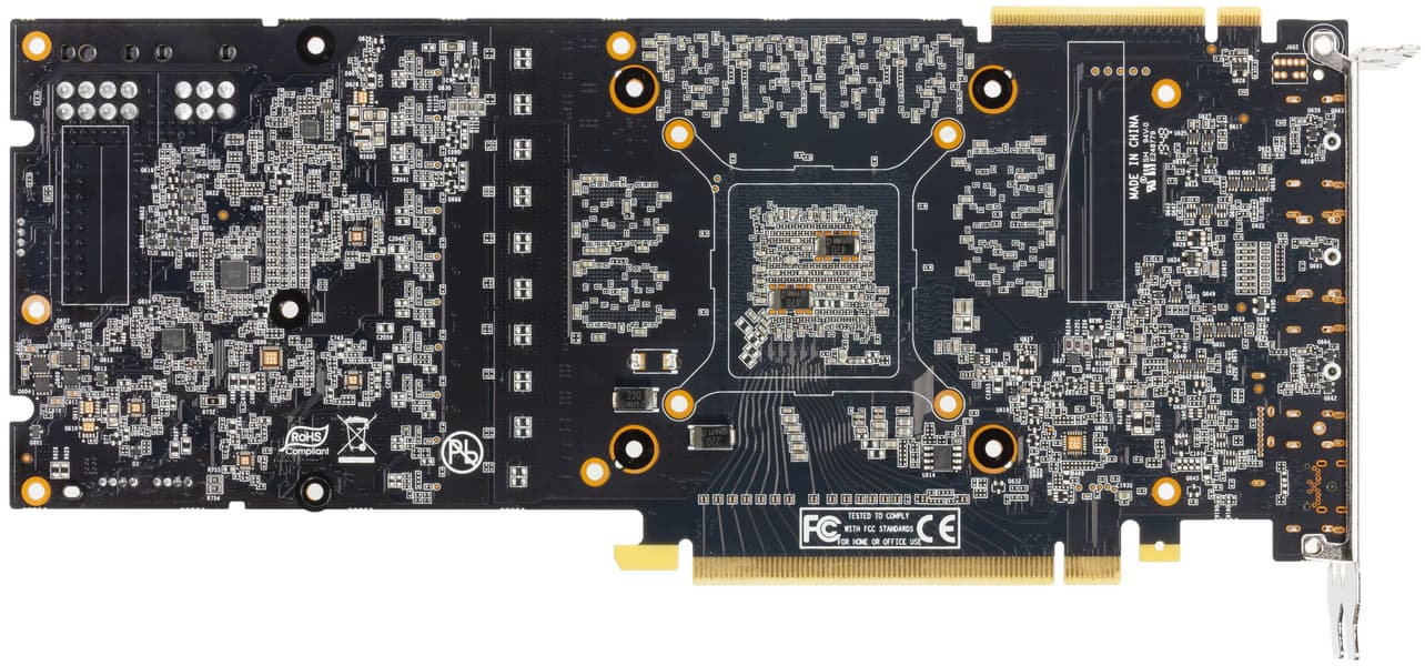 Здесь используется один массивный пластинчатый радиатор, его пересекает шесть тепловых трубок для улучшения рассеивания тепла по ребрам. Трубки припаяны к медному основанию, которое и прижимается к GPU. Для охлаждения микросхем памяти и силовых элементов предусмотрена большая платформа-подошва. На обороте карты установлена толстая пластина, служащая исключительно элементом декора. В итоге система охлаждения видеокарты укладывается по толщине в 2,5 слота (де-факто 3 слота).
