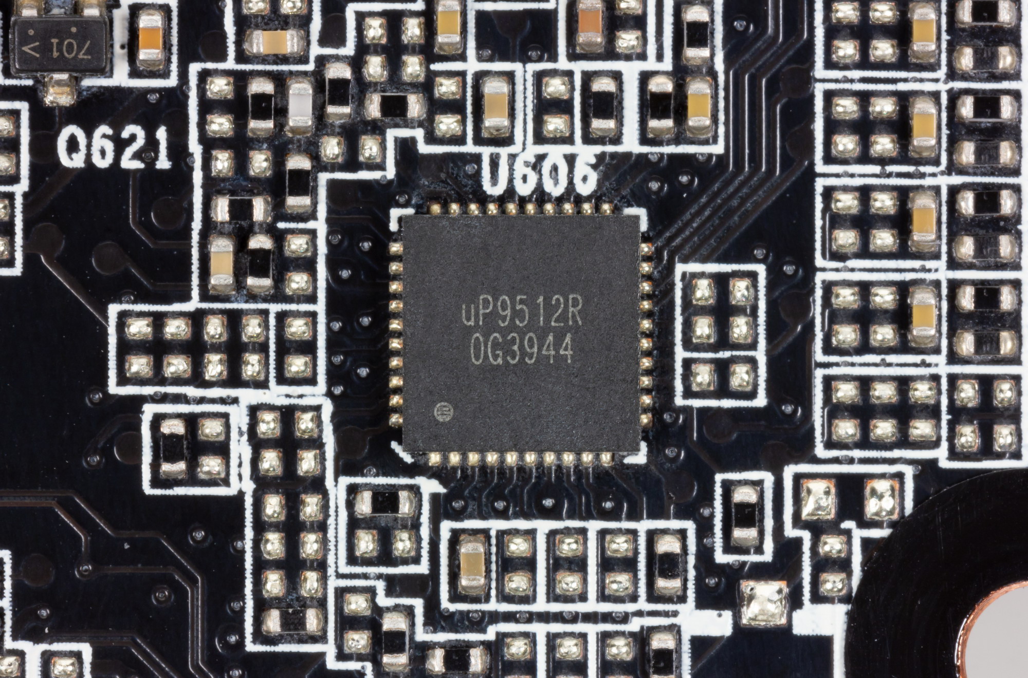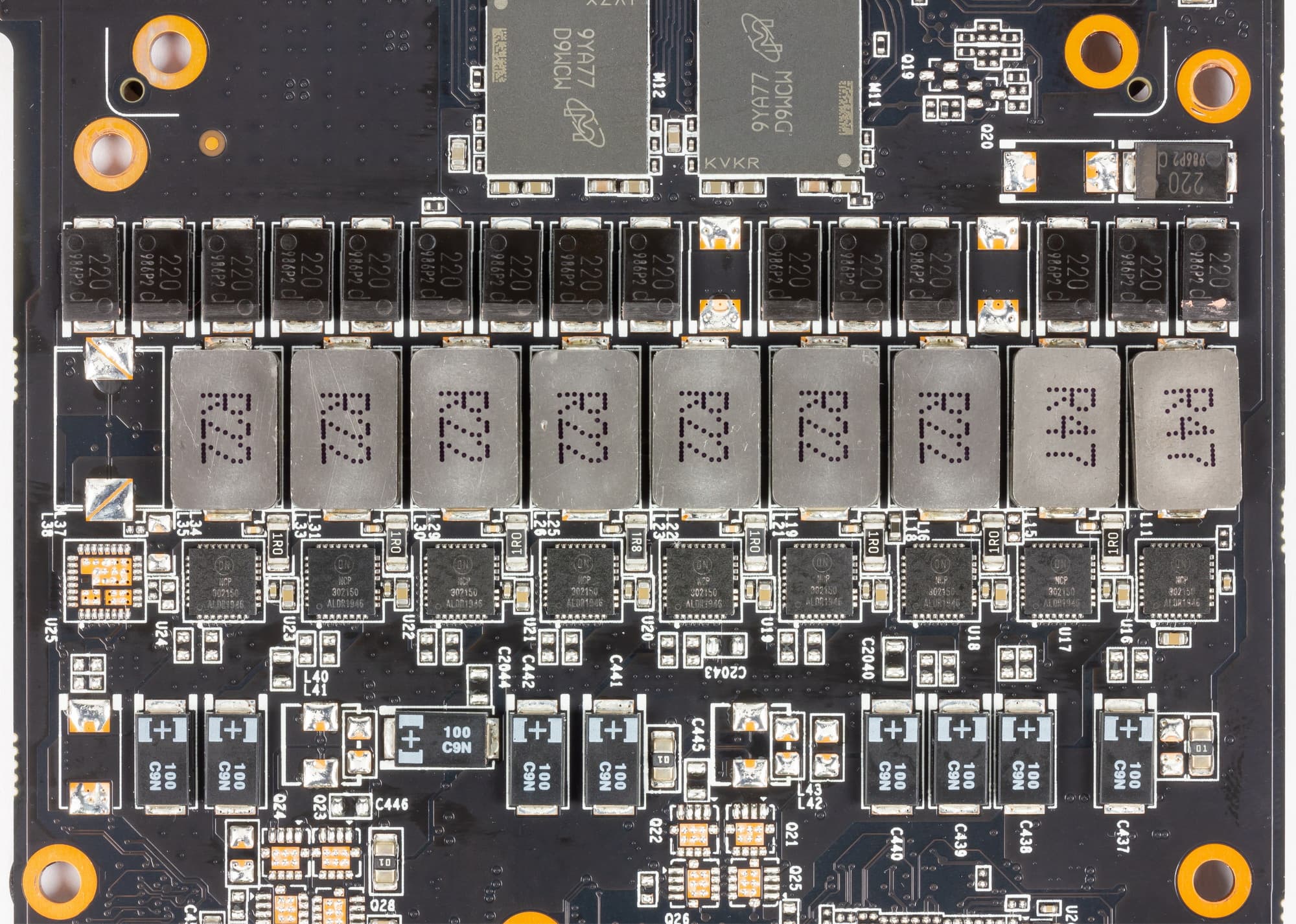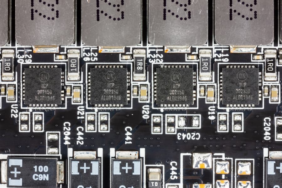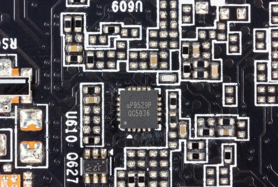 Такая динамическая система управления питанием способна осуществлять мониторинг тока чаще раза в миллисекунду, что дает жесткий контроль над поступающим на ядро питанием и помогает GPU дольше работать на повышенных частотах. Схема управляется ШИМ-контроллером uP9512 (uPI Semiconductor).