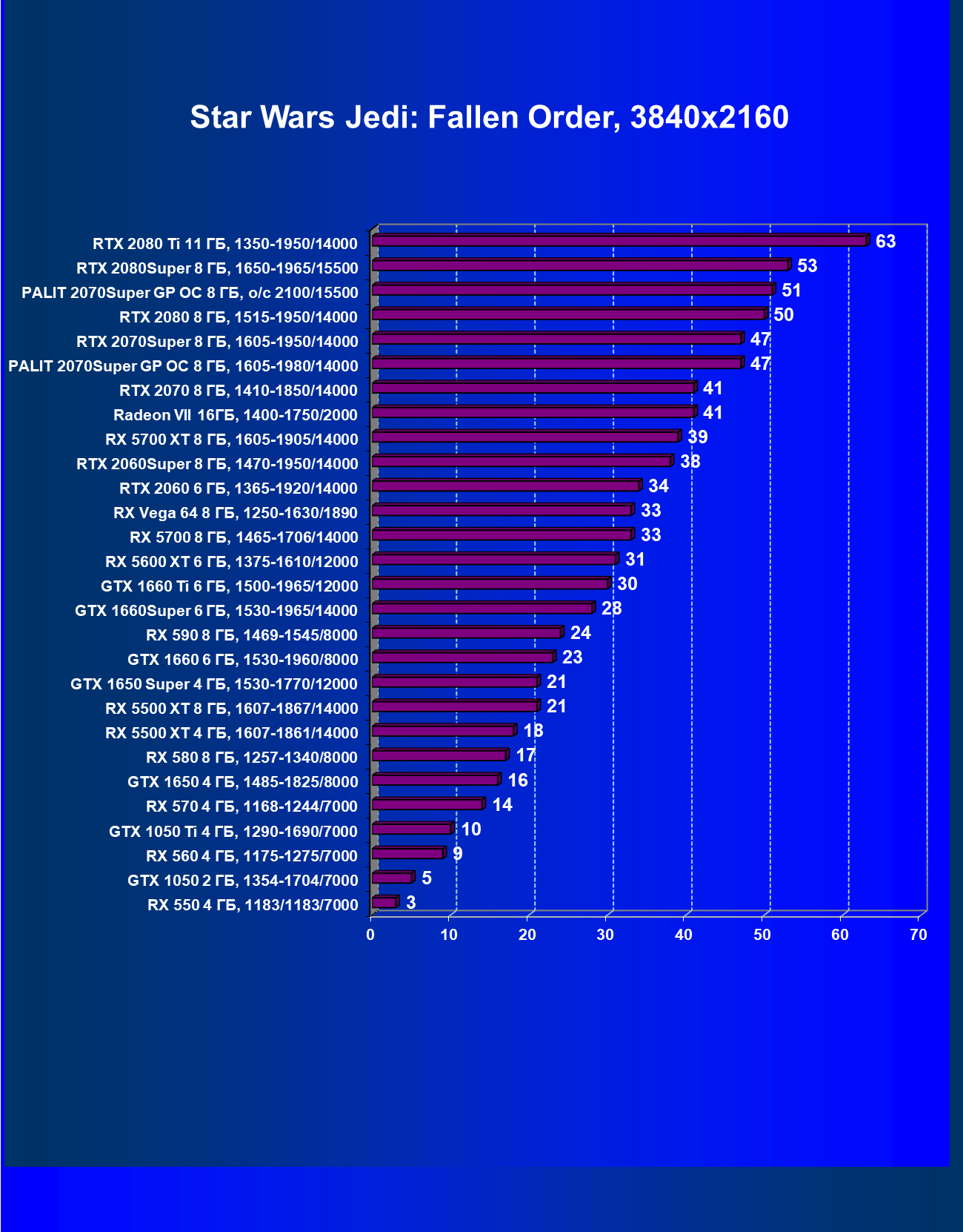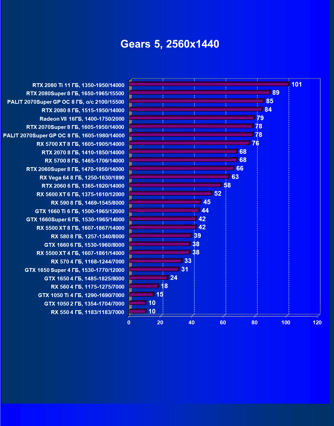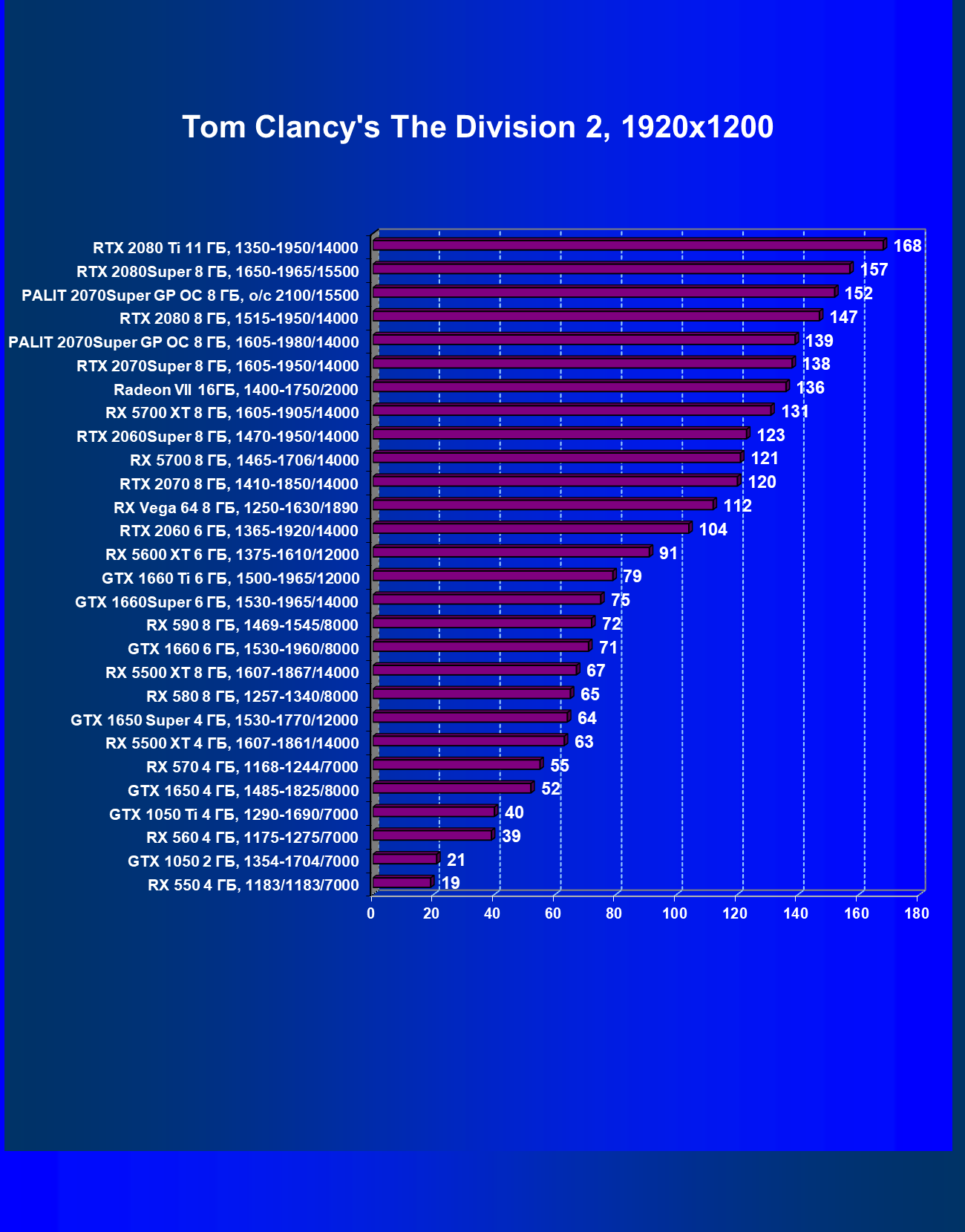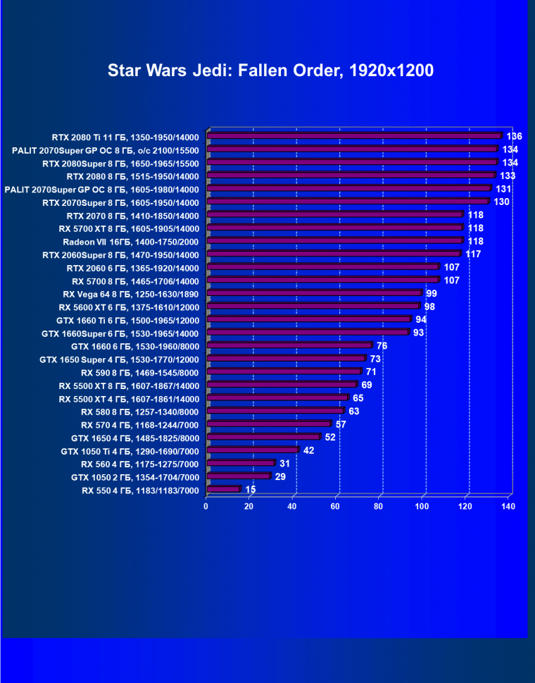 | 03 | RX 5700 XT 8 ГБ, 1605—1905/14000 | 401 | 1082 | 27 000 |