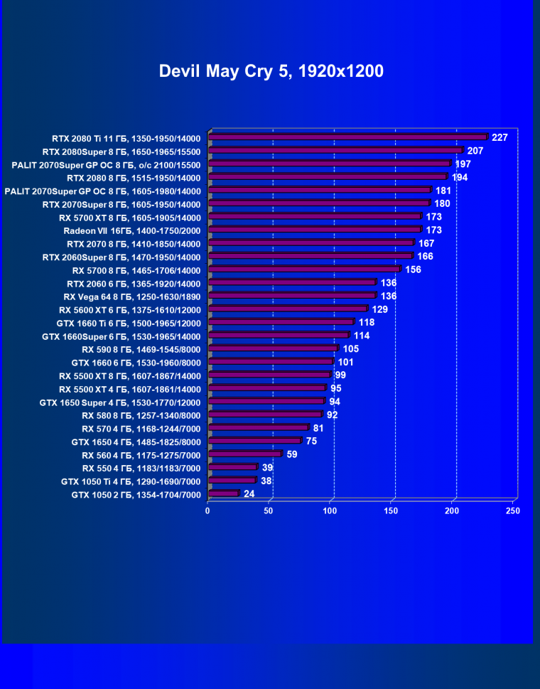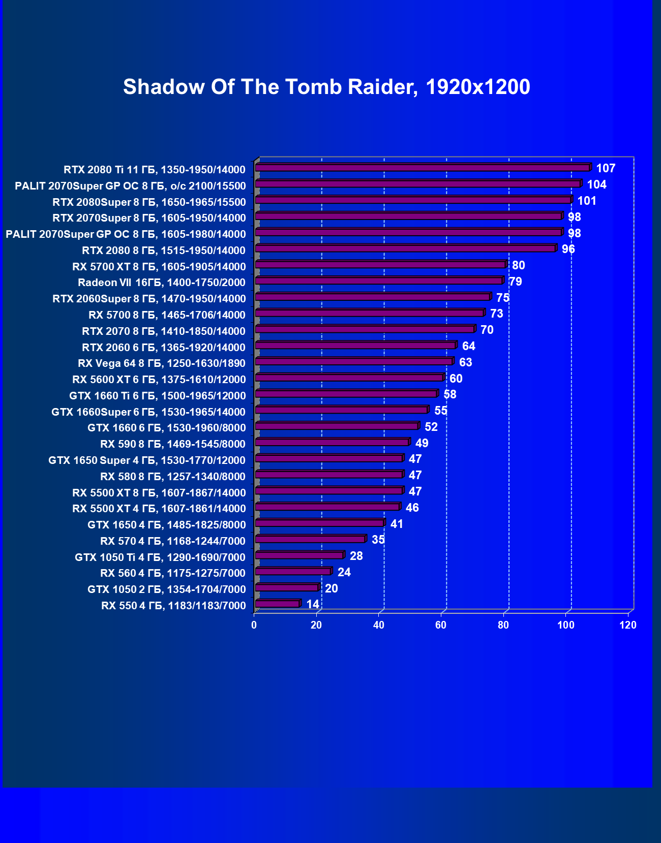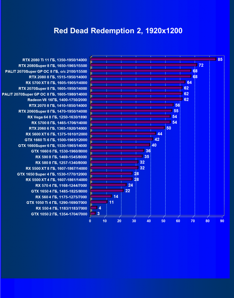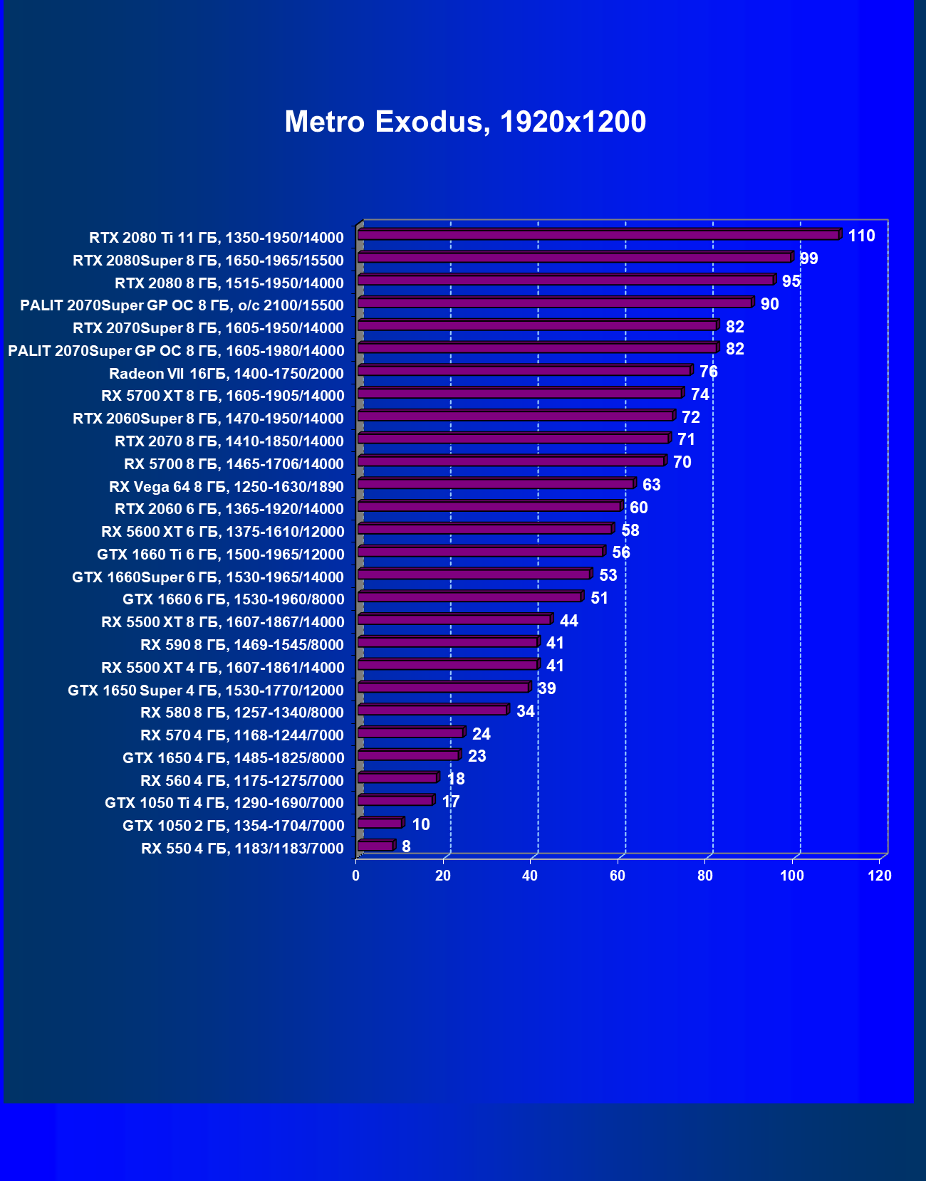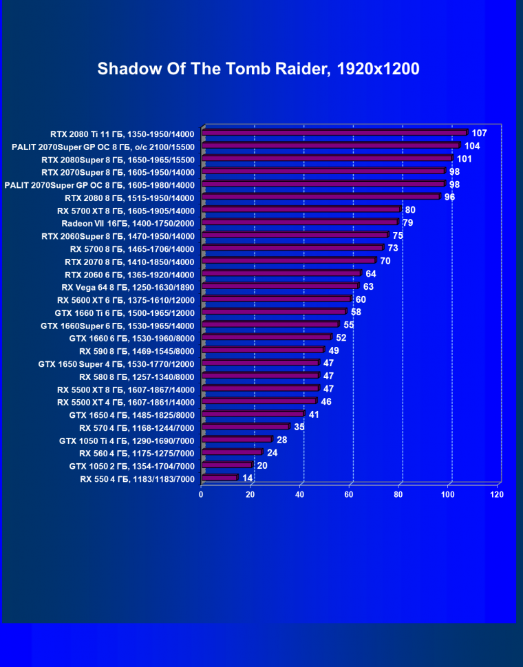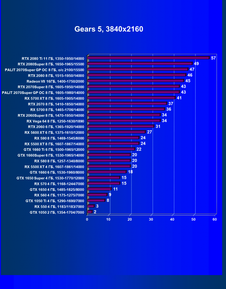 | 08 | RX 5700 XT 8 ГБ, 1605—1905/14000 | 1090 | 404 | 27 000 |