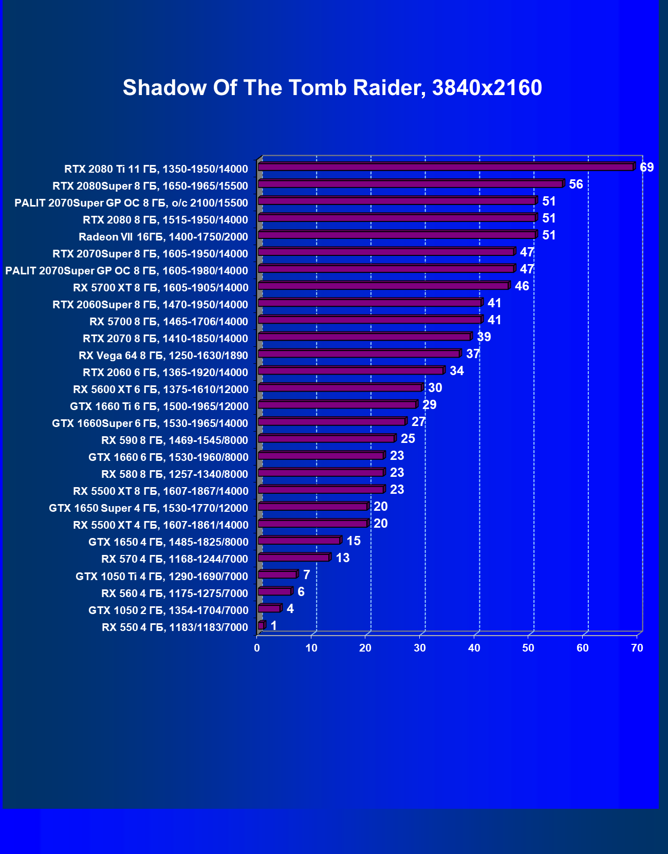 | 07 | RTX 2070 Super 8 ГБ, 1605—1950/14000 | 365 | 1244 | 34 100 |
