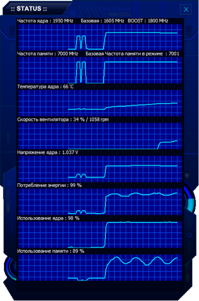 Для проверки разгона я использовал встроенный в фирменную утилиту NV Scanner, и автоматический разгон смог немного поднять максимальную частоту работы GPU до 2010 МГц, что обеспечило прирост частоты в 3% относительно референсных значений. Однако мне показалось, что этого недостаточно, и я вручную выставил Boost-частоту ядра 1952 (+152) МГц и частоту памяти 15500 (+375) МГц (увеличив лимит по энергопотреблению до 113%). Итоговый прирост в производительности составил около 9%.