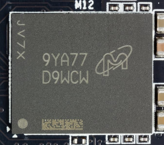 Карта имеет 8 ГБ памяти GDDR6 SDRAM, размещенной в 8 микросхемах по 8 Гбит на лицевой стороне PCB. Микросхемы памяти Micron (GDDR6, MT61K256M32JE-14) рассчитаны на номинальную частоту работы в 3500 (14000) МГц. Расшифровщик кодов на упаковках FBGA находится здесь.