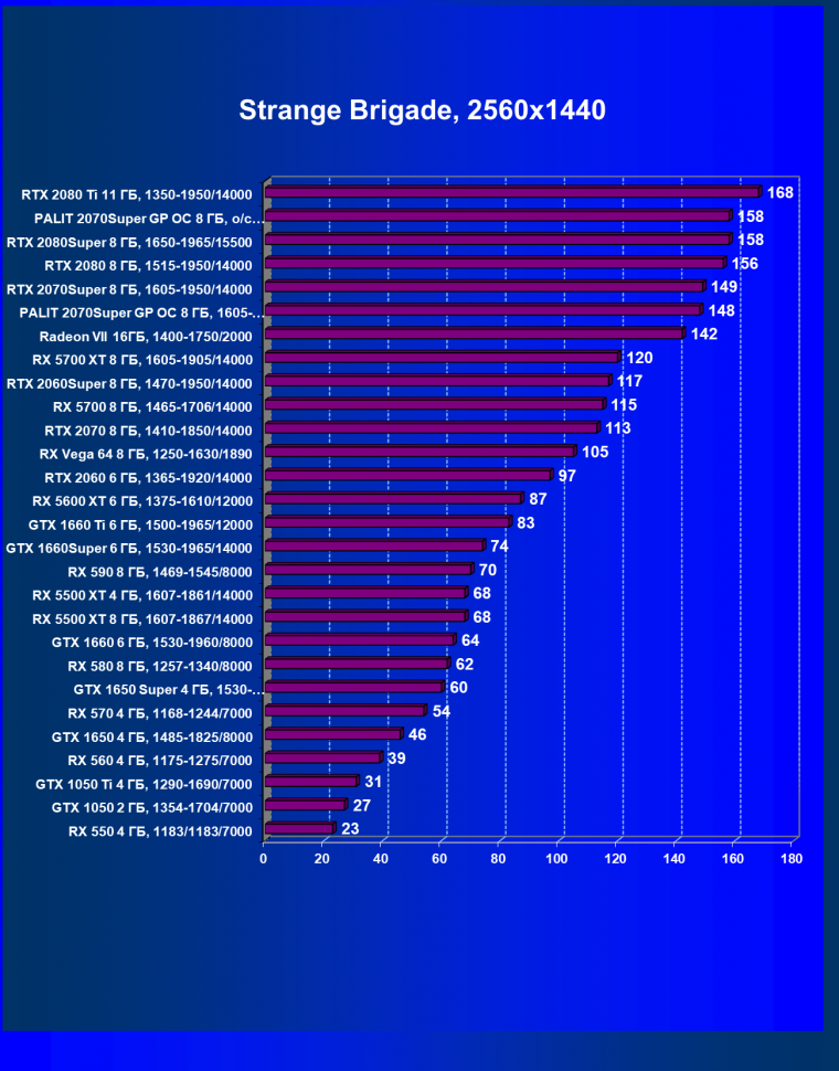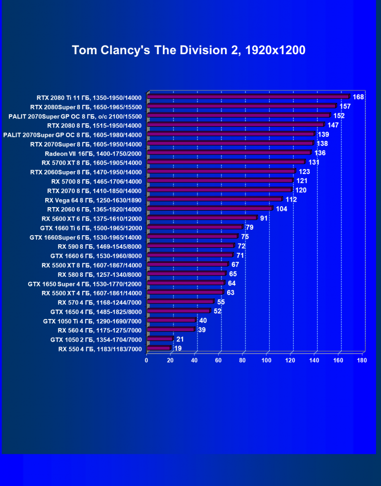 Рейтинг ускорителей iXBT.com демонстрирует нам функциональность видеокарт друг относительно друга и нормирован по самому слабому ускорителю — Radeon RX 550 (то есть сочетание скорости и функций RX 550 приняты за 100%). Рейтинги ведутся по 28 ежемесячно исследуемым нами акселераторам в рамках проекта Лучшая видеокарта месяца. Из общего списка выбирается группа карт для анализа, куда входят RTX 2070 Super и его конкуренты.