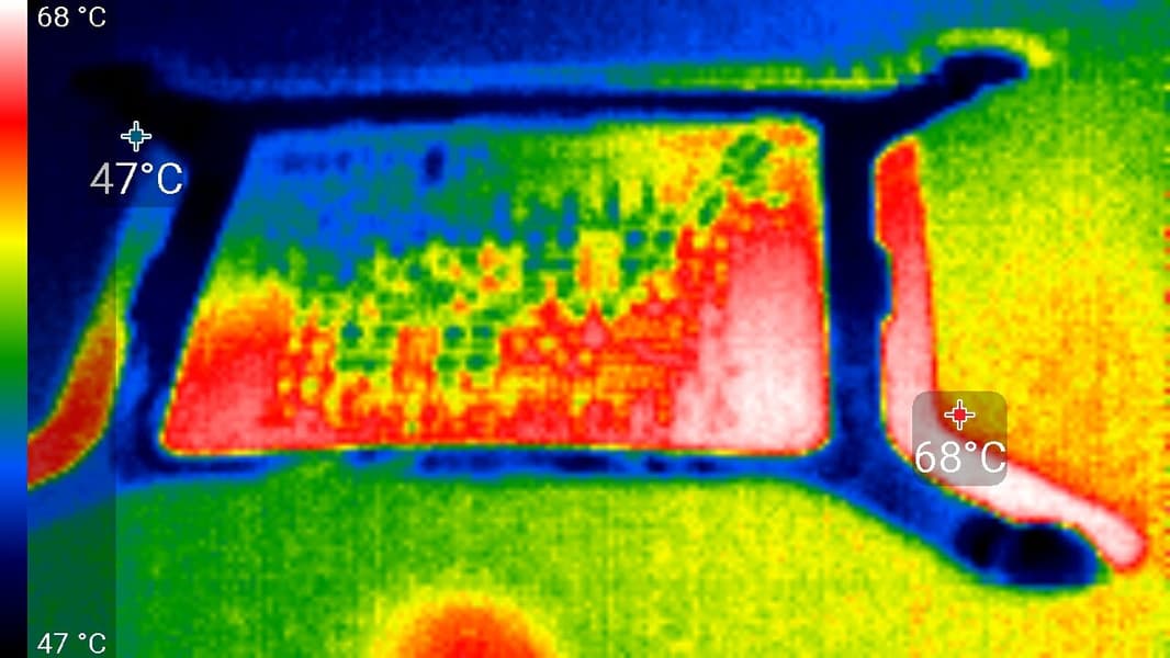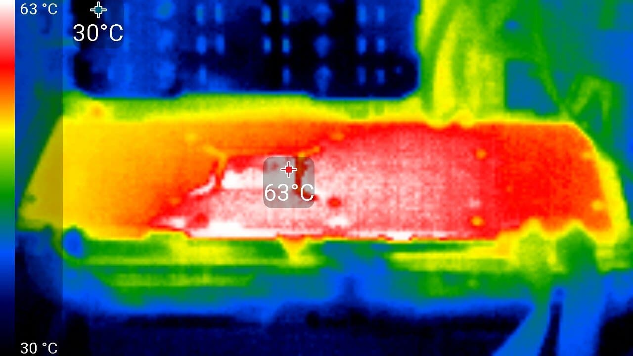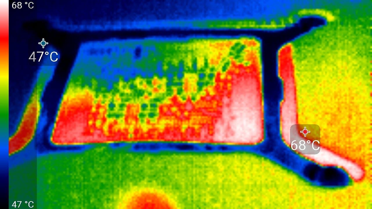 Максимальный нагрев — центральная часть PCB, которую видно в вырезе пластины с обратной стороны.