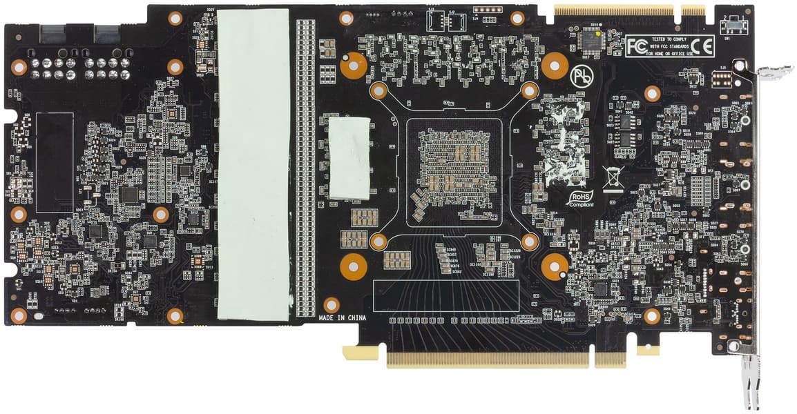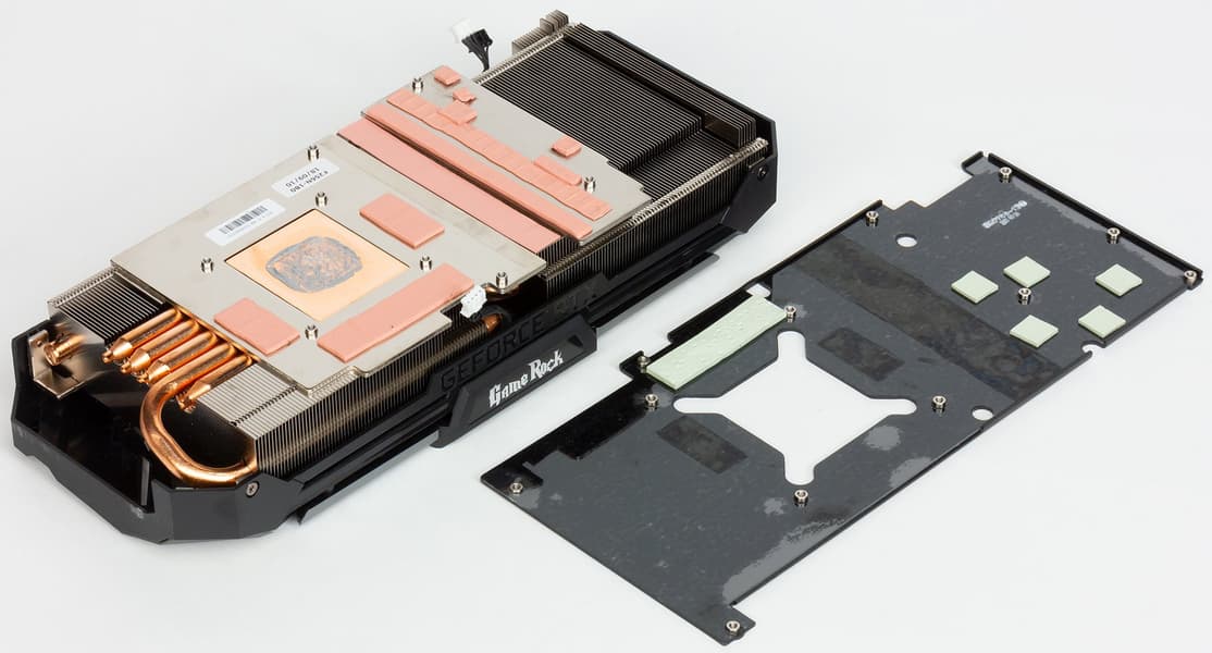 Главной частью кулера являются два массивных пластинчатых никелированных радиатора, соединенные между собой тепловыми трубками, впрессованными в основание, которые обеспечивают равномерное распределение тепла по ребрам радиатора. Поверх радиаторов установлен кожух с двумя вентиляторами, работающими на одинаковой частоте вращения. Вентиляторы имеют особый профиль лопаток, называемый производителем TurboFan Blade 2.0. По словам Palit, это помогает уменьшить шум при весьма высоком КПД охлаждения радиаторов. Также надо заметить, что если переключить работу карты на BIOS2 (референсные частоты), то кулер останавливает вентиляторы в случае простоя или малой нагрузки (если температура GPU не выше 50-55 градусов). Поэтому не стоит пугаться, если при запуске ПК вентиляторы на ускорителе не вращаются. Микросхемы памяти охлаждаются основной пластиной вместе с ядром (кстати, она сделана из медного сплава), а силовые транзисторы охлаждаются отдельной пластиной, прикрученной ко второму радиатору. На обороте видеокарты установлена толстая пластина, которая обеспечивает жесткость относительно массивной видеокарты (предотвращая изгиб печатной платы), а также служит дополнительным радиатором для PCB (к которой она прижата через термоинтерфейс). СО оснащена подсветкой, цветом которой можно управлять с помощью вышеупомянутой утилиты ThunderMaster.