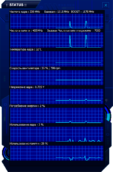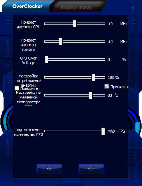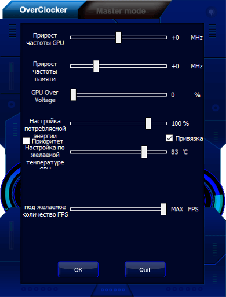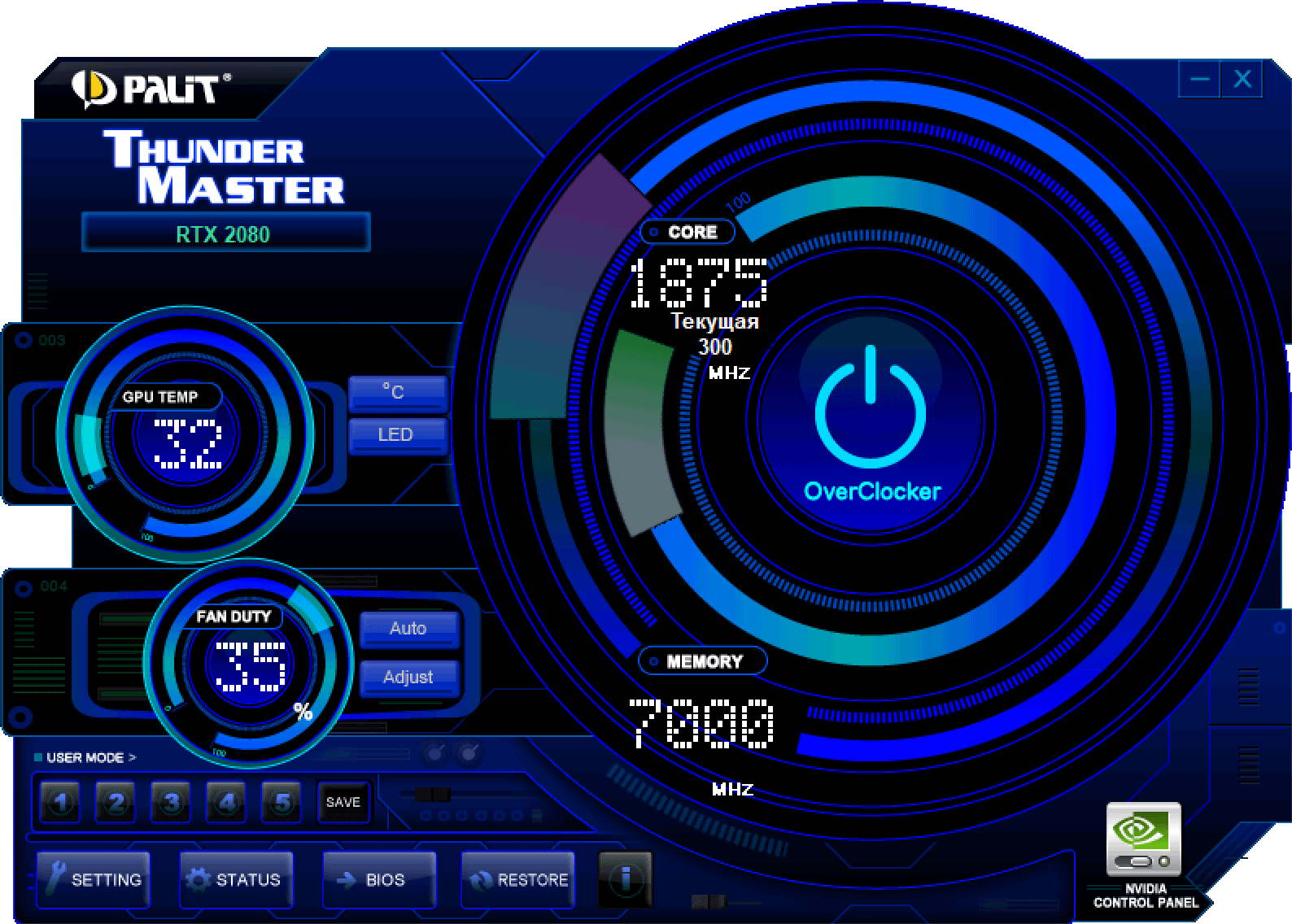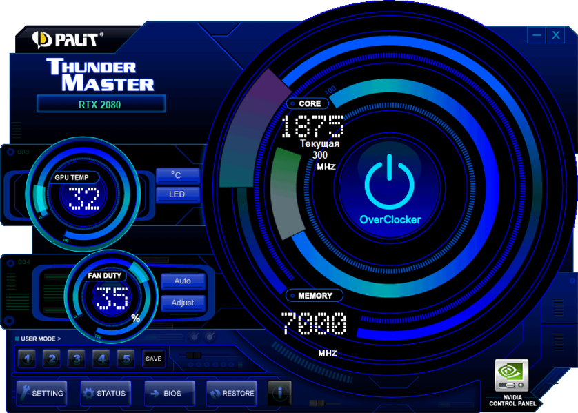 Смена режимов работы карты (а также ручное выставление частот) обеспечивается с помощью фирменной утилиты Palit, которую можно скачать с сайта производителя.