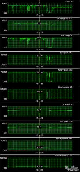 После 6-часового прогона под нагрузкой максимальная температура ядра не превысила 71 градуса, что является отличным результатом для видеокарты такого уровня.