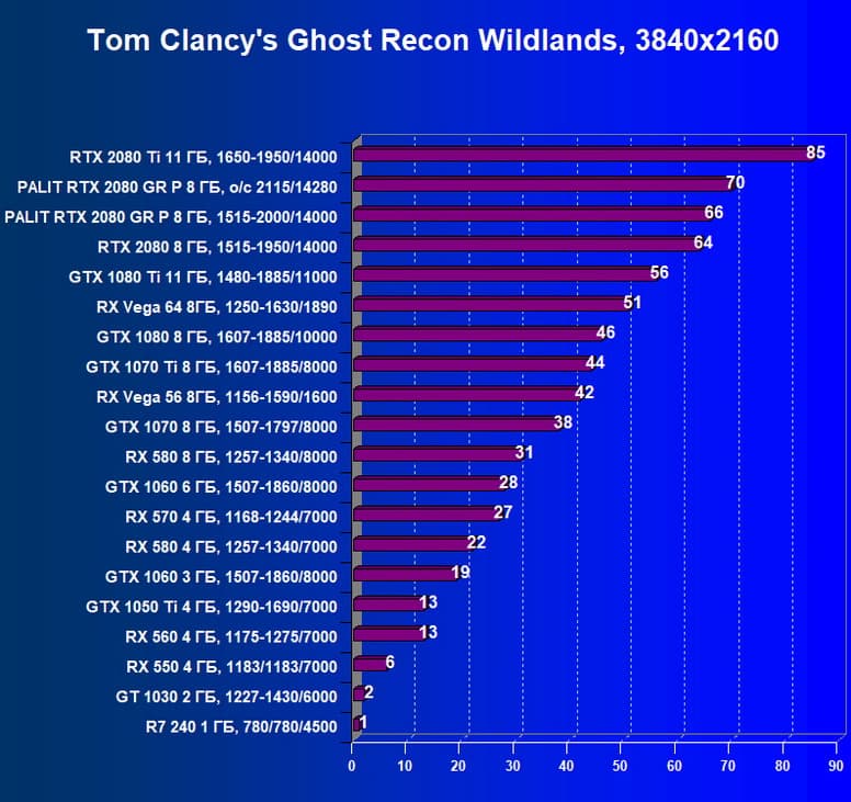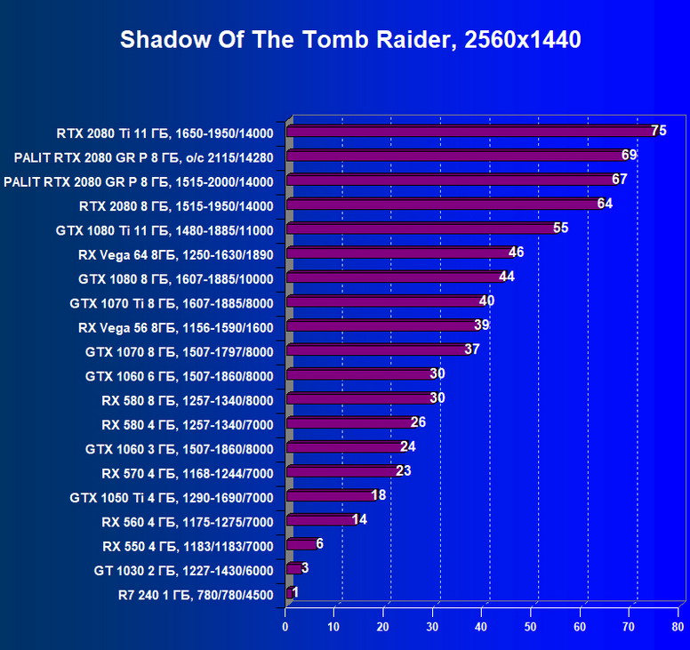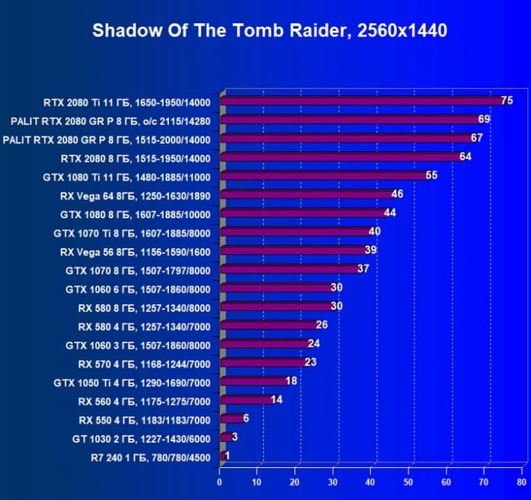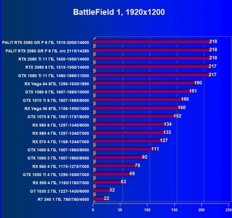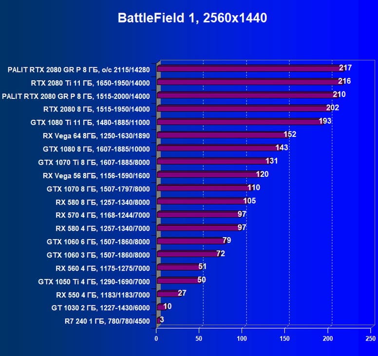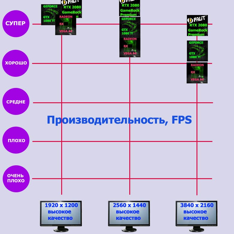 Эта карта (как и все ускорители на базе RTX 2080) прекрасно подойдет, если вы хотите играть при максимальном качестве графики в любые игры в разрешении до 2560×1440 включительно, да и в разрешении 4К при тех же настройках графики ускоритель выдаст хорошую производительность в большинстве игр. Следом идет GTX 1080 Ti, а RX Vega 64 в этой тройке на третьем месте.