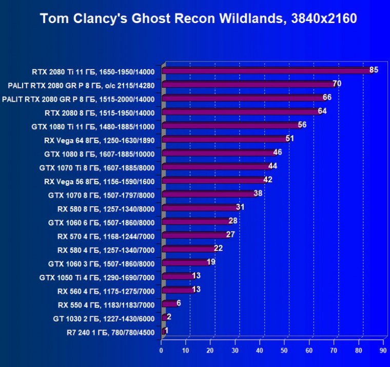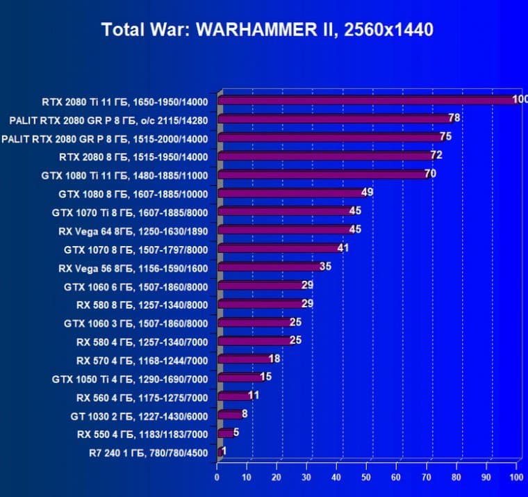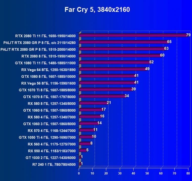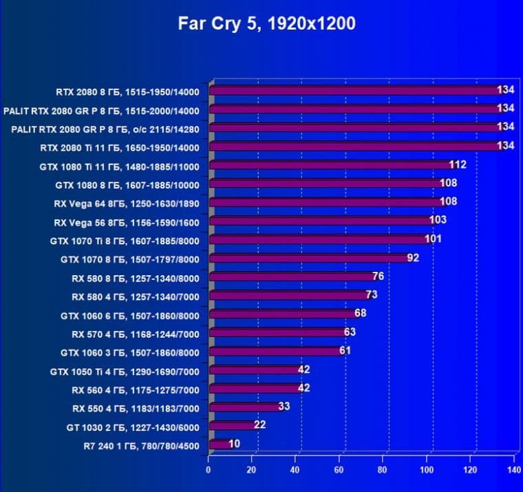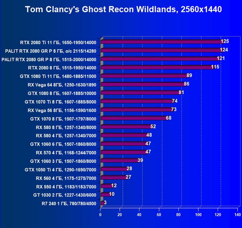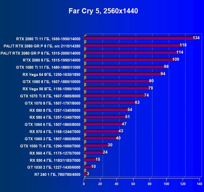 Эта карта (как и все ускорители на базе RTX 2080) прекрасно подойдет, если вы хотите играть при максимальном качестве графики в любые игры в разрешении до 2560×1440 включительно, да и в разрешении 4К при тех же настройках графики ускоритель выдаст хорошую производительность в большинстве игр. Следом идет GTX 1080 Ti, а RX Vega 64 в этой тройке на третьем месте.
