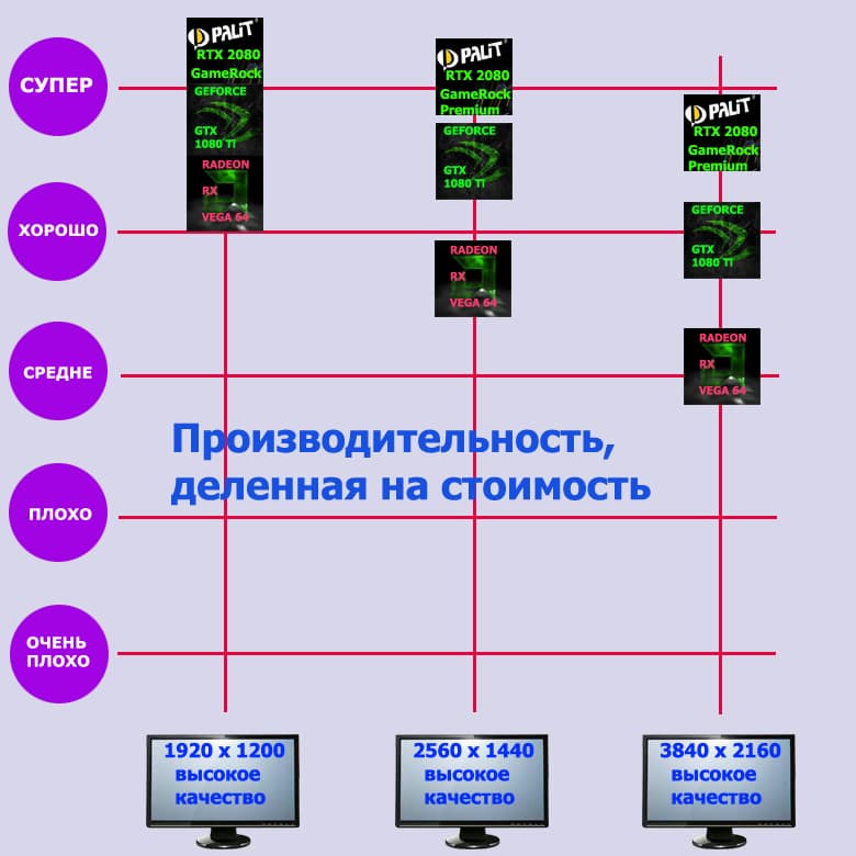 Этот рейтинг полностью повторяет предыдущий. Да, несмотря на то, что RTX 2080 дороже, чем GTX 1080 Ti, он в целом все же выгоднее (цены на вторичном рынке мы, понятно, не учитываем, особенно с учетом того, что там могут попадаться полумертвые карты после майнинга). RX Vega 64 давно уже пора дешеветь, эта карта замыкает группу. Ну а ускоритель Palit быстрее и дешевле, чем вариант Founder’s Edition, так что он легко стал первым в своей группе.