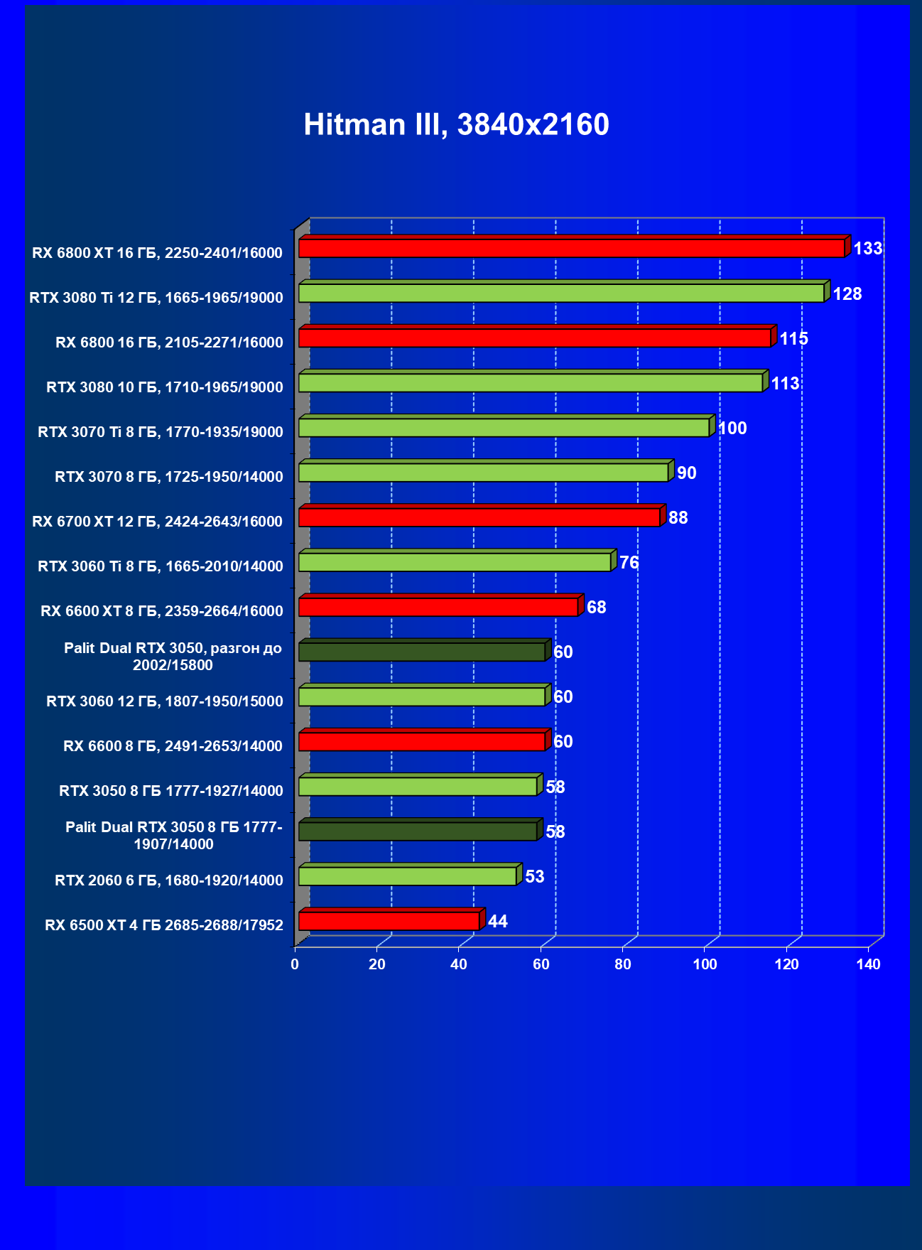 | 01 | Palit Dual RTX 3050 8 ГБ, разгон до 2002/15800 | 72 | 330 | 46 000 |
