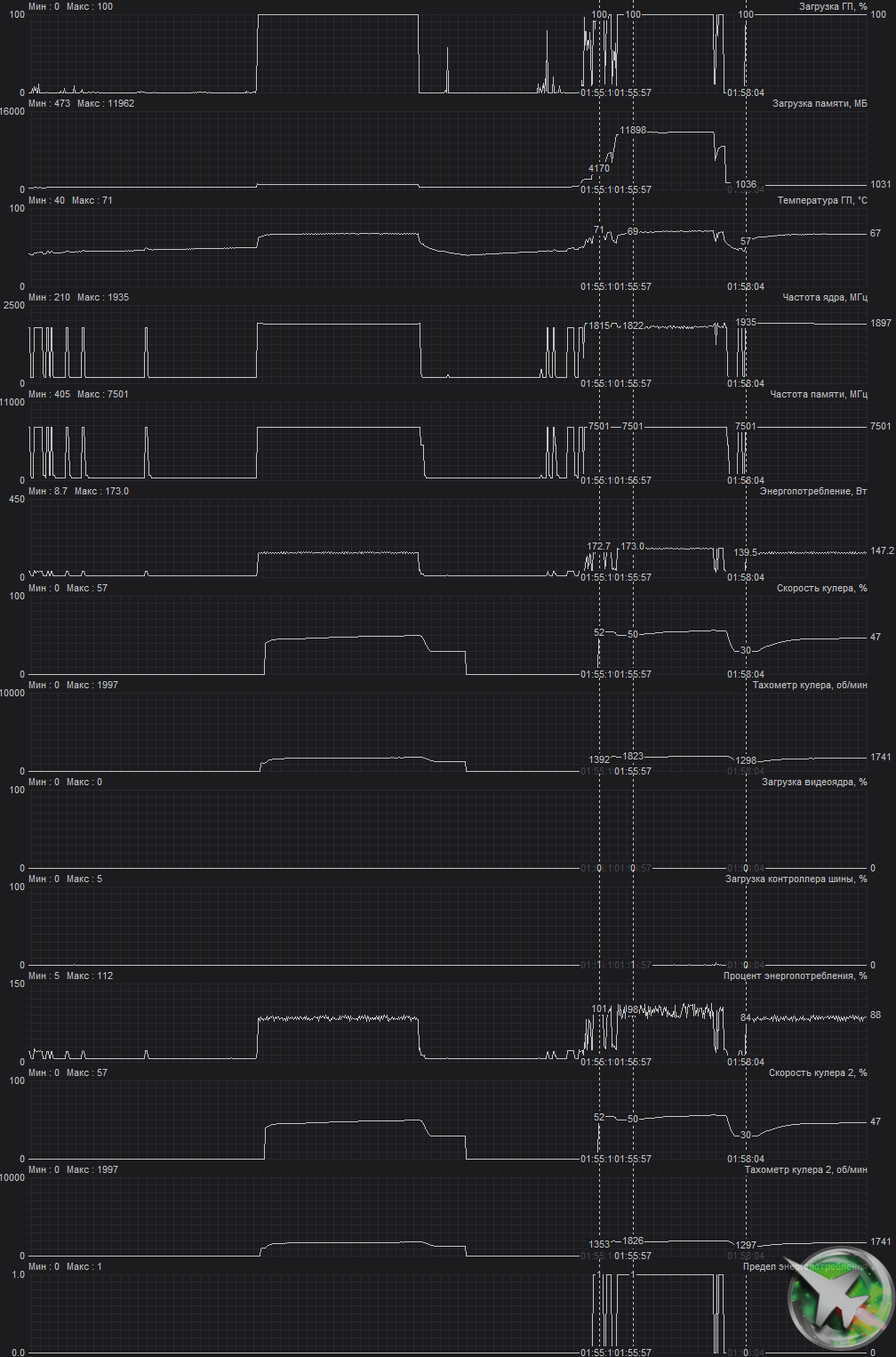 При описанном ручном разгоне параметры работы карты особо не менялись, однако максимальное потребление выросло до 158 Вт.