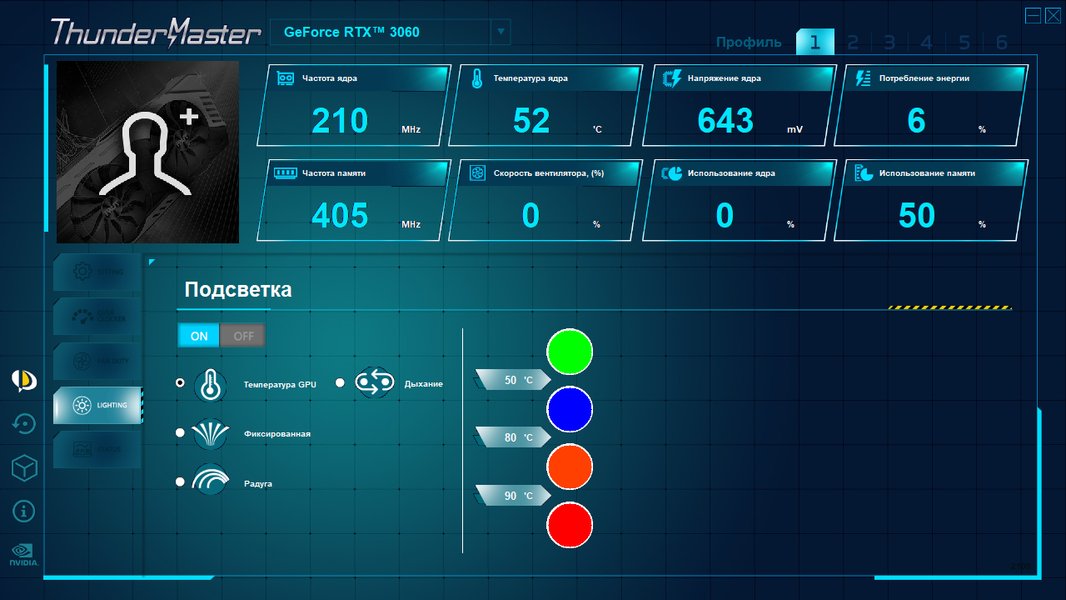Управление режимами подсветки, в том числе и ее отключением, осуществляется той же утилитой Thunder Master.