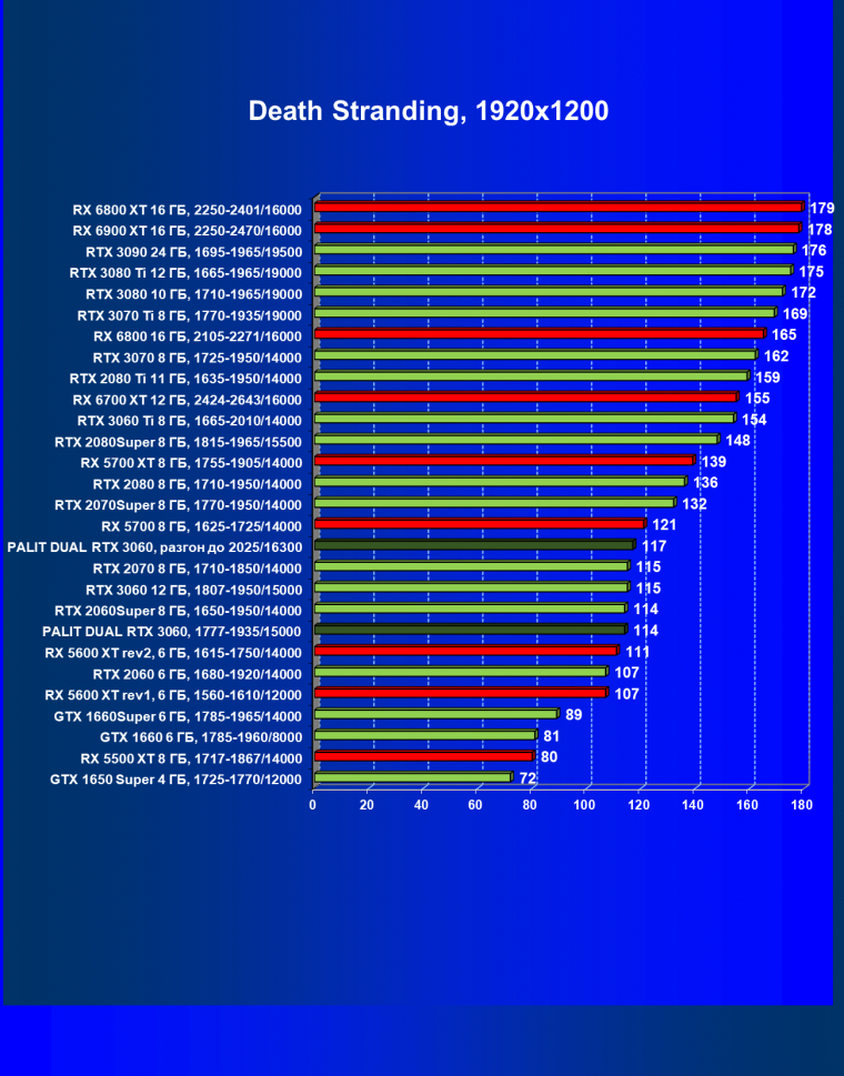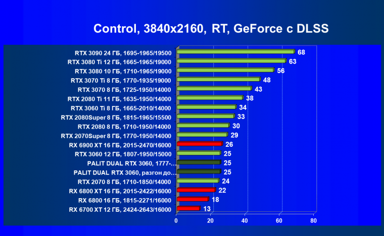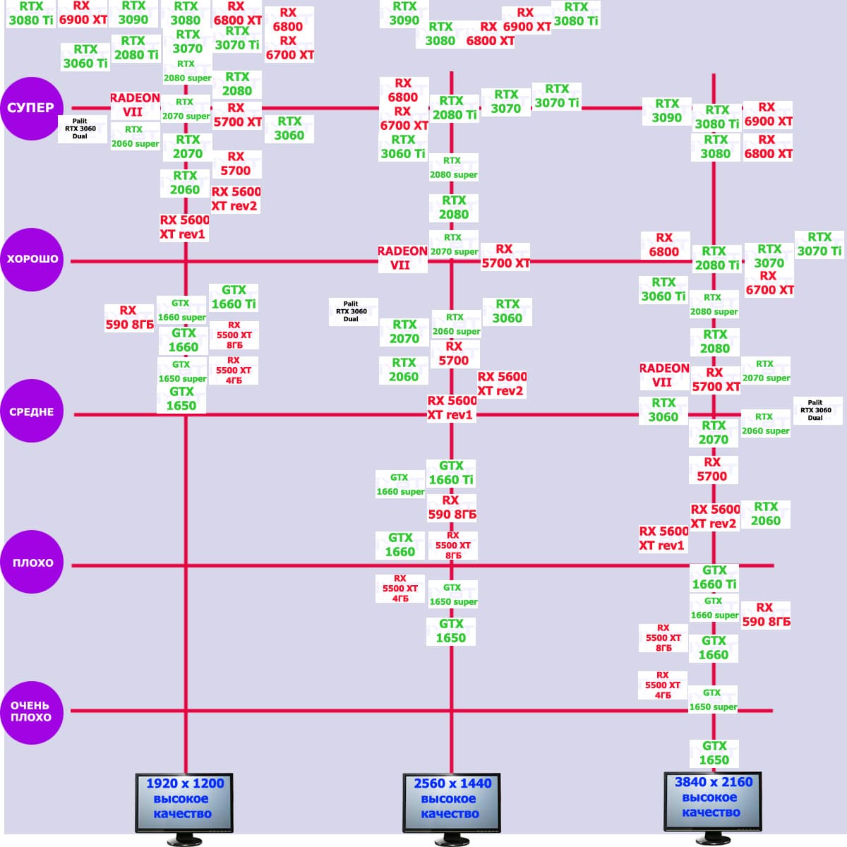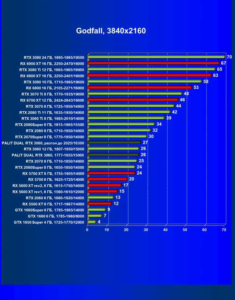 | 19 | RX 6600 XT 8 ГБ, 2359—2664/16000 | 70 | 10 | 68 000 |