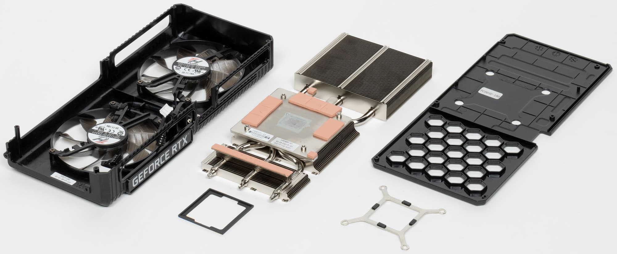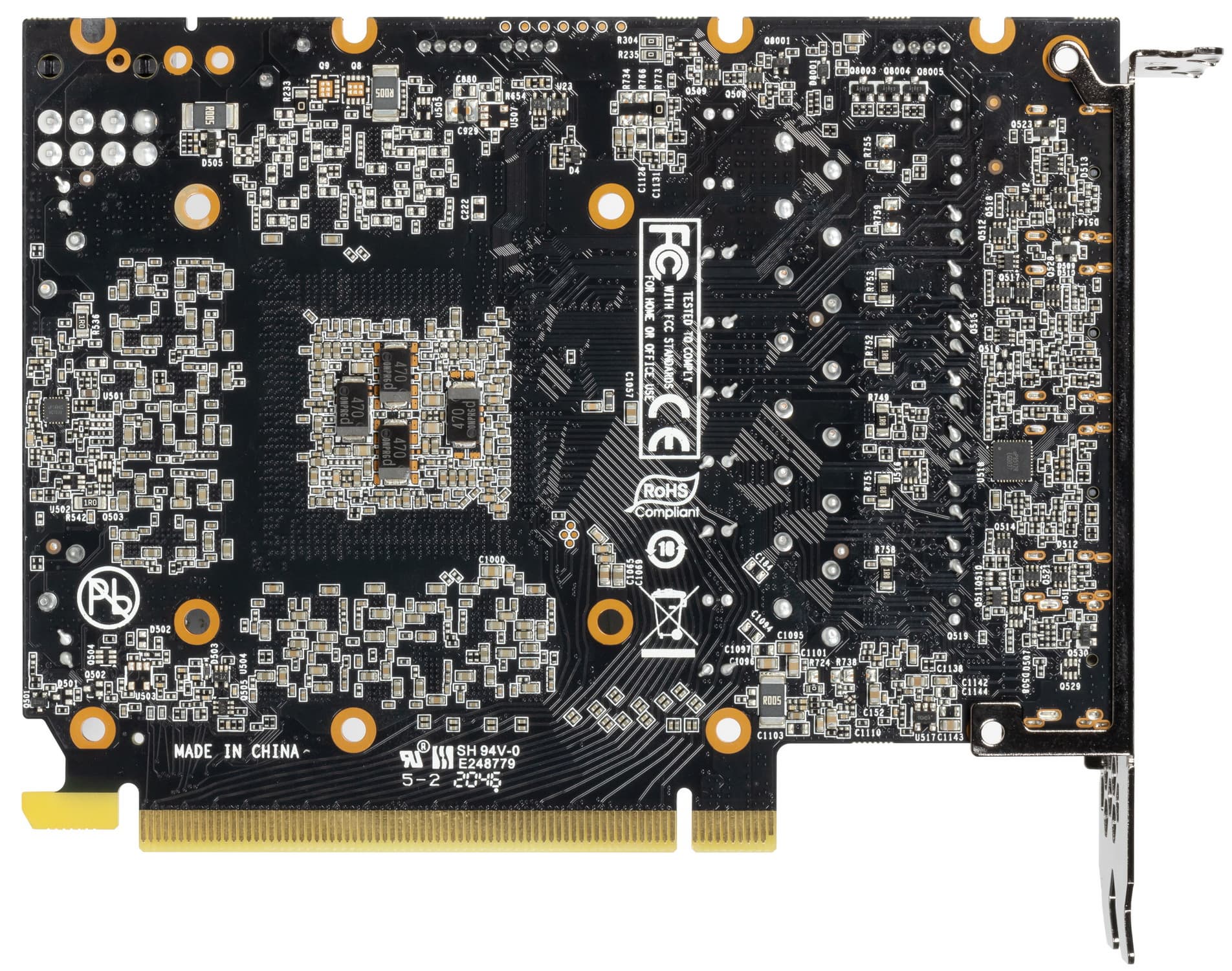 Поверх радиатора установлен кожух с двумя вентиляторами TurboFan 3.0 (∅95 мм). Как и у референс-карты, крайний правый (на фото) вентилятор продувает радиатор насквозь, через отверстия в задней пластине.