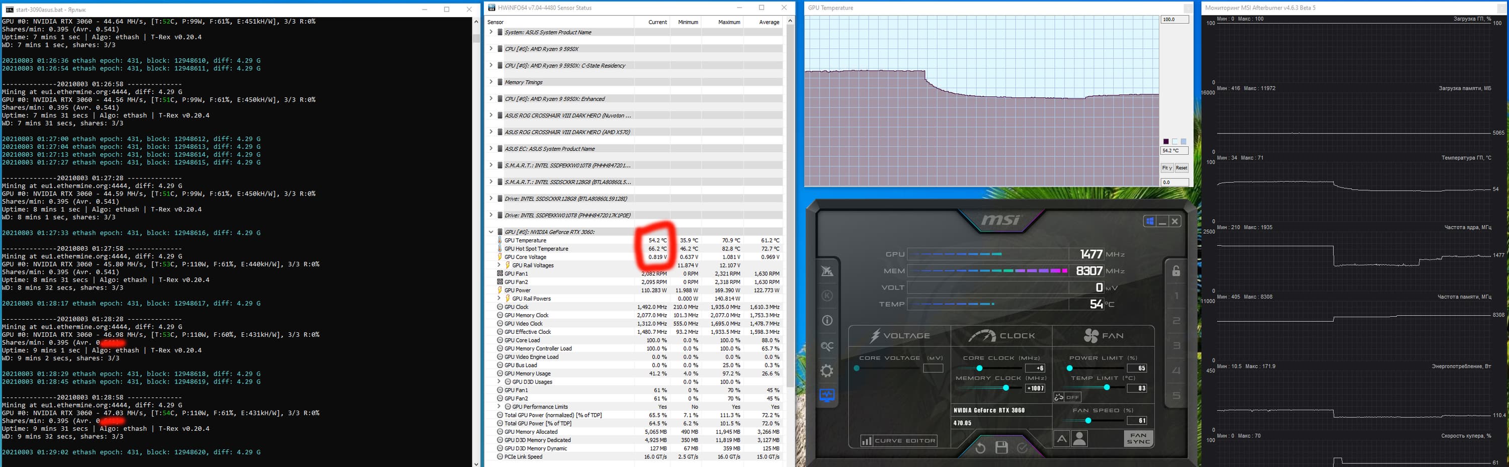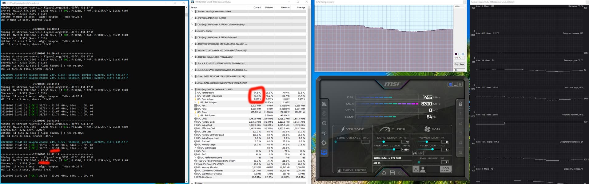 Для подсчета хэшрейта (hashrate) при майнинге «эфира» (Ethereum/ETH/ETC) и «вороны» (Ravencoin/RVN) использовался майнер T-Rex (0.20.04), фиксировался средний показатель за 2 часа в двух режимах: