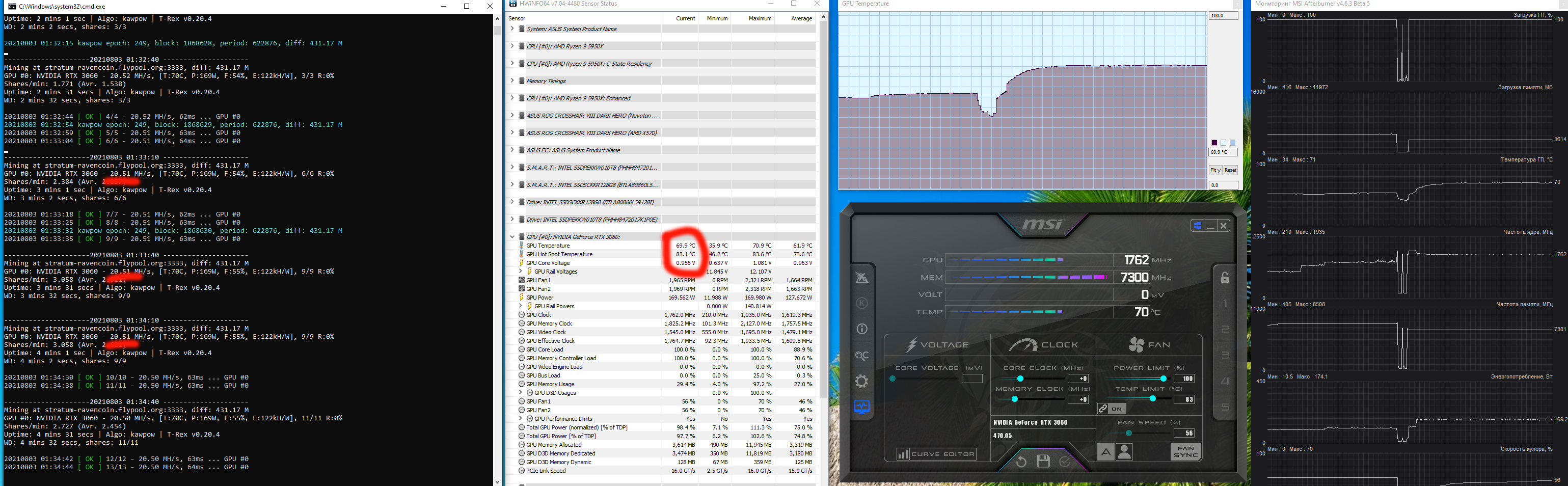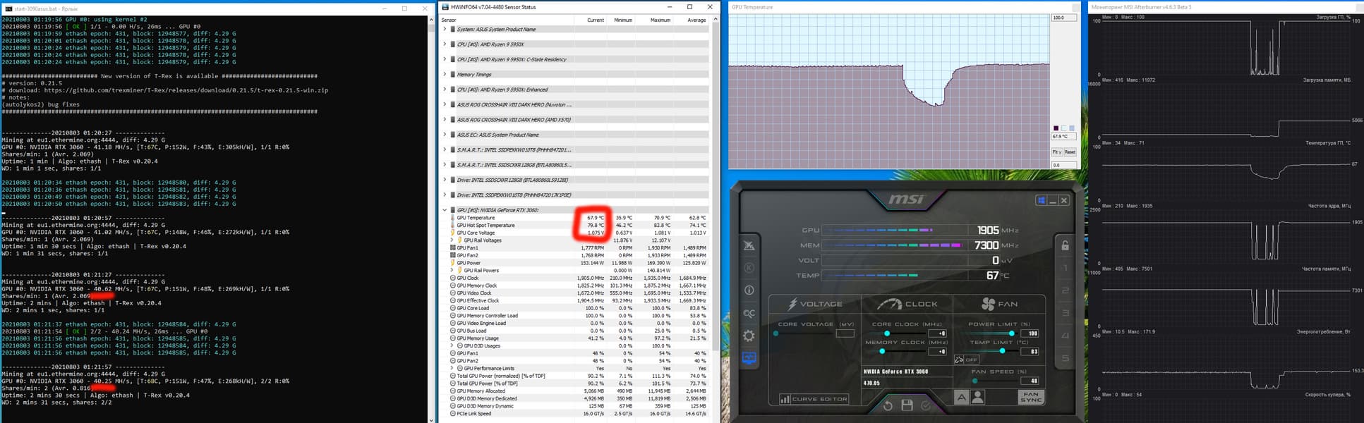Если мы запускаем майнинг ETH с установками параметров работы карты по умолчанию, то карта дает изначально чуть больше 41 мегахеша в секунду (затем производительность может подняться до 42-43), нагрев ядра чуть ниже 70 градусов. Подчеркну еще раз: на драйвере версии 470.05! Если у вас карта 3060 LHR, то этот драйвер такую карту не знает, и потому придется ставить последнюю актуальную версию, при этом получите около 22-23 мегахешей в секунду.