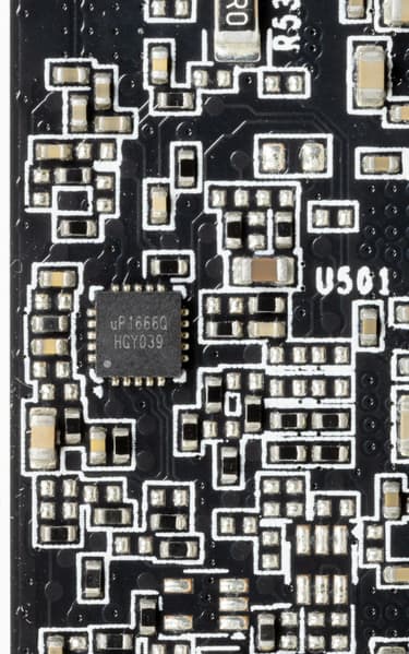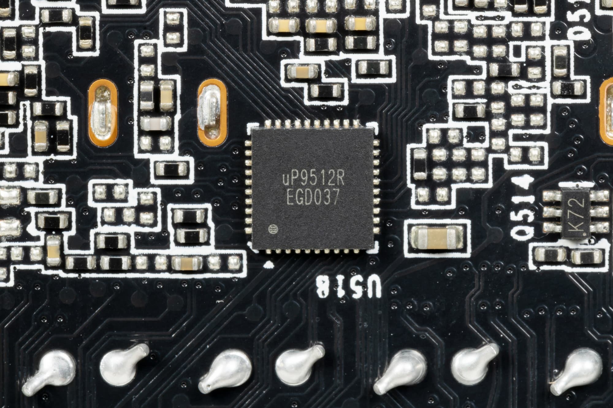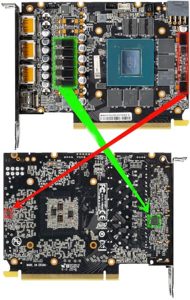 Зеленым цветом отмечена схема питания ядра, красным — памяти. ШИМ-контроллер uP9512R (uPI Semiconductor) отвечает за работу фаз питания графического процессора.