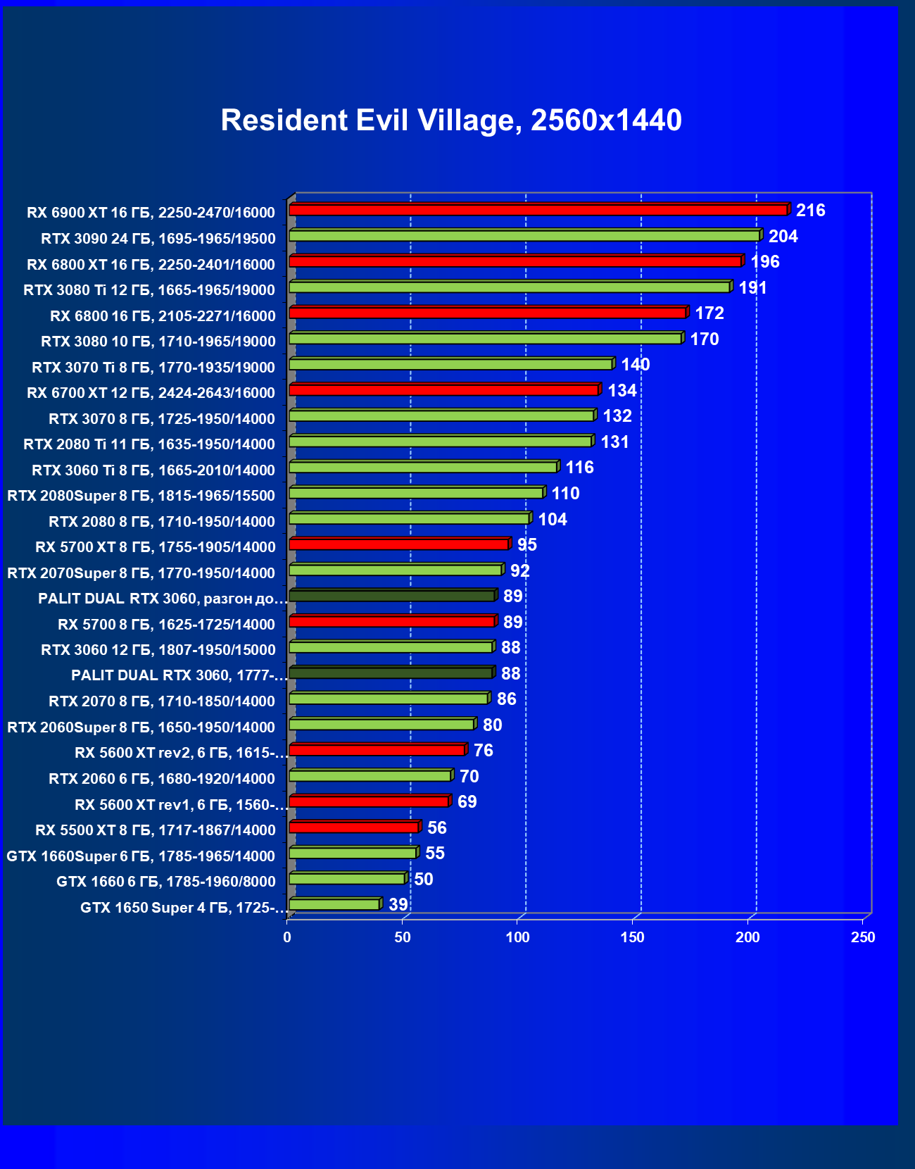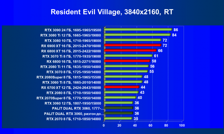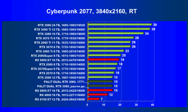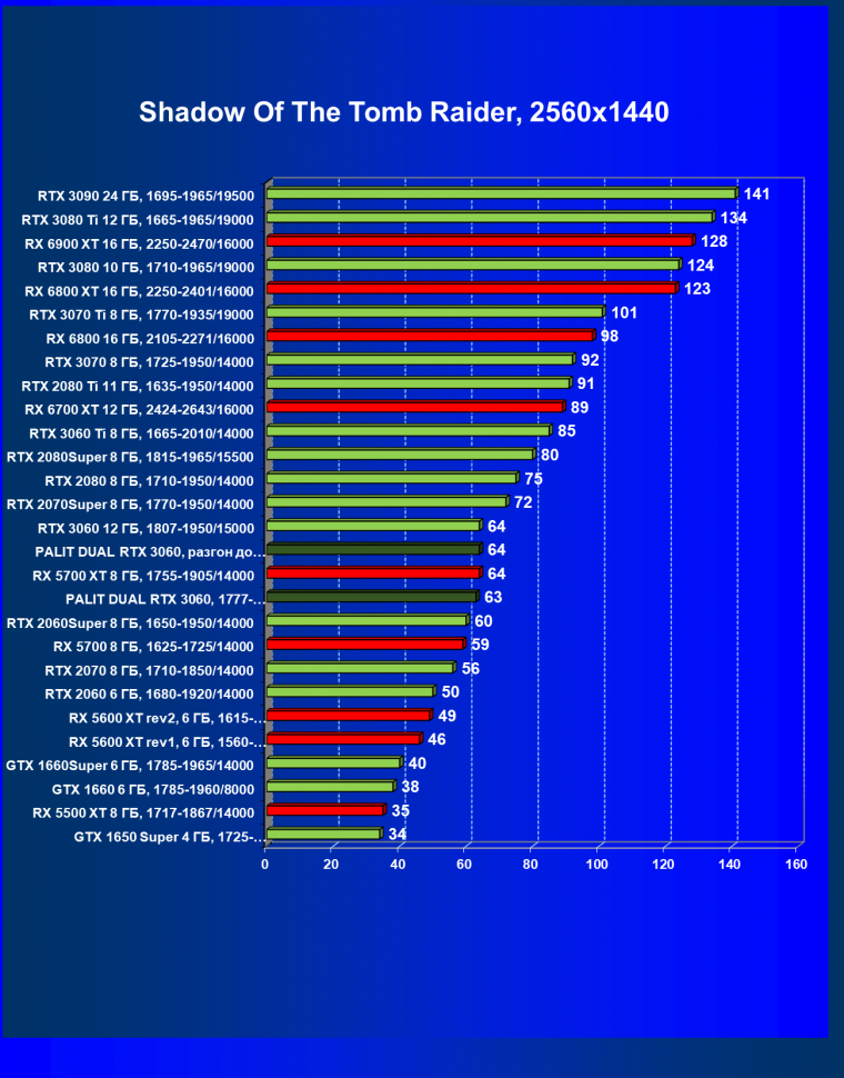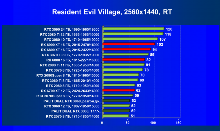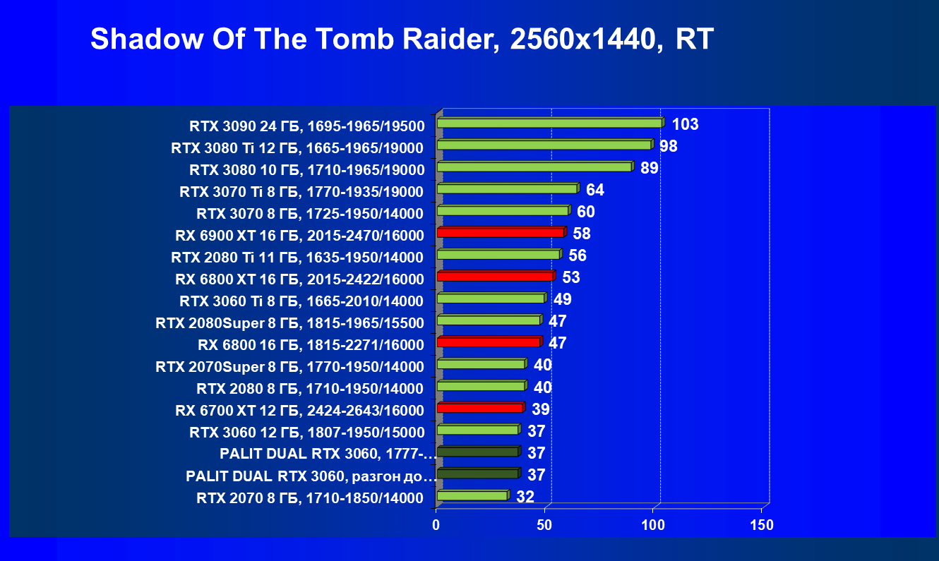 RTX 3060 обходит конкурентов в лице RTX 2070 и RX 5700 XT, но вот с RX 6600 XT ему тягаться тяжело, карта Palit логично показала полное равенство с референс-продуктом, а ручной разгон ей практически ничего не дал, ибо несмотря на разовые всплески частот работы GPU выше 2 ГГц, все же лимит потребления не позволял частотам в целом как-то подниматься выше 1935 — 1940 МГц. Так что, RTX 2070 Super — в лидерах в группе (на цены смотреть нет смысла, ибо на 2ххх поколение они исключительно спекулятивные, да и карты можно найти в основном на вторичном рынке), а также Radeon RX 6600 XT смотрится более привлекательно.