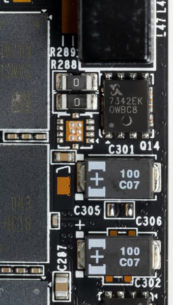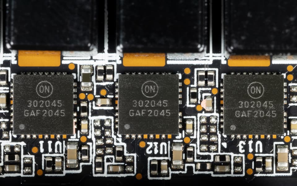 В преобразователе питания, традиционно для всех видеокарт Nvidia, используются транзисторные сборки DrMOS — в данном случае мосфеты схемы питания GPU NCP302045 (On Semiconductor) и мосфеты схемы питания памяти SM7342EKKP (Sinopower).