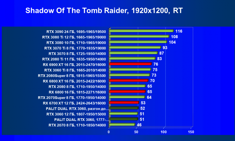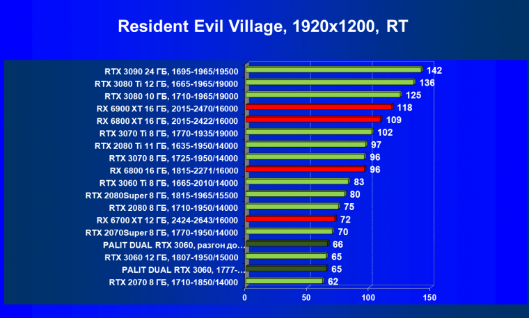 Разумеется, как и в случае со старшими ускорителями новой серии, GeForce RTX 3060 реализует в играх все преимущества технологии трассировки лучей в сочетании с DLSS. И в том же разрешении Full HD производительность GeForce RTX 3060 при включении RT+DLSS является более чем достаточной. Да и без DLSS во многих играх с RT новинка показывает приличную скорость. GeForce RTX 3060 является прямым конкурентом ускорителям Radeon RX 6600 XT/5700 XT и прошлым GeForce RTX 2070 и GeForce RTX 2060 Super. Radeon RX 6600 XT выигрывает в традиционных играх с растеризацией, но сильно проигрывает в играх с RT, поэтому итоговую оценку дать сложно.