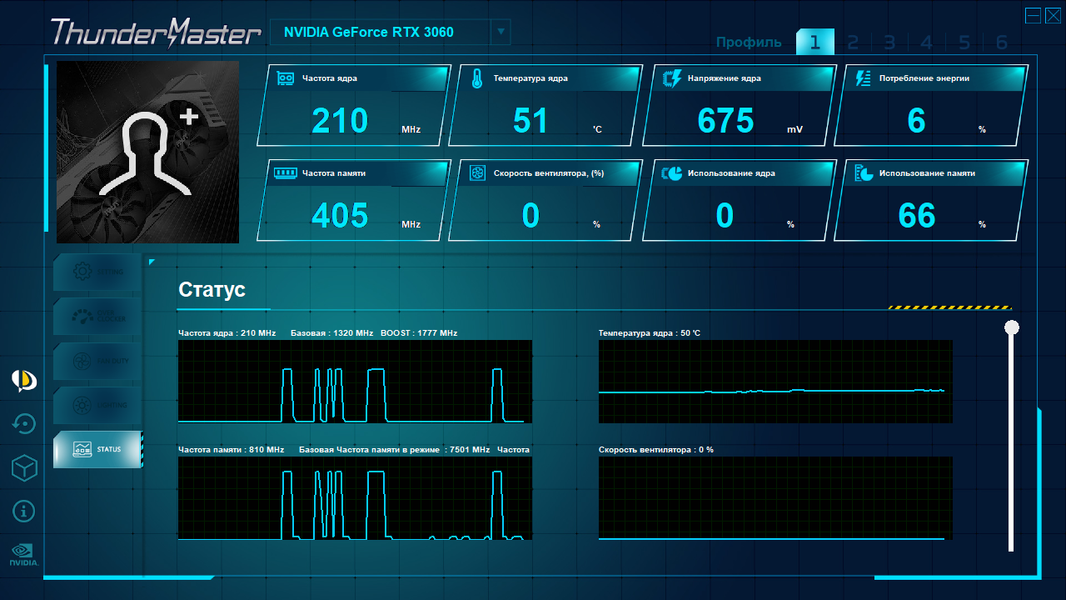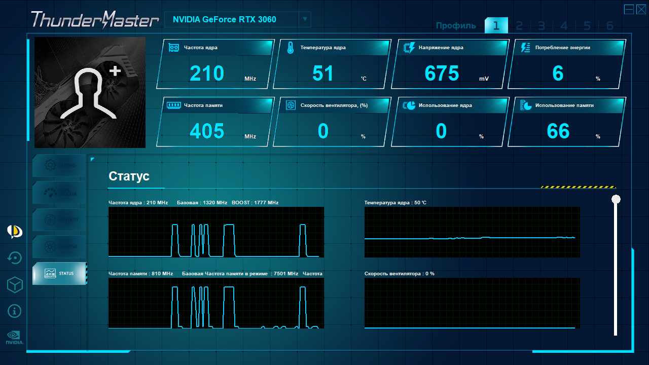 Компания Palit выпускает свою собственную программу для контроля и управления работой видеокарт — ThunderMaster. Вот и данная карта легко распознается этой утилитой. Полагаю, что комментировать ее возможности нет нужды: имеется русскоязычный интерфейс, всё интуитивно понятно.