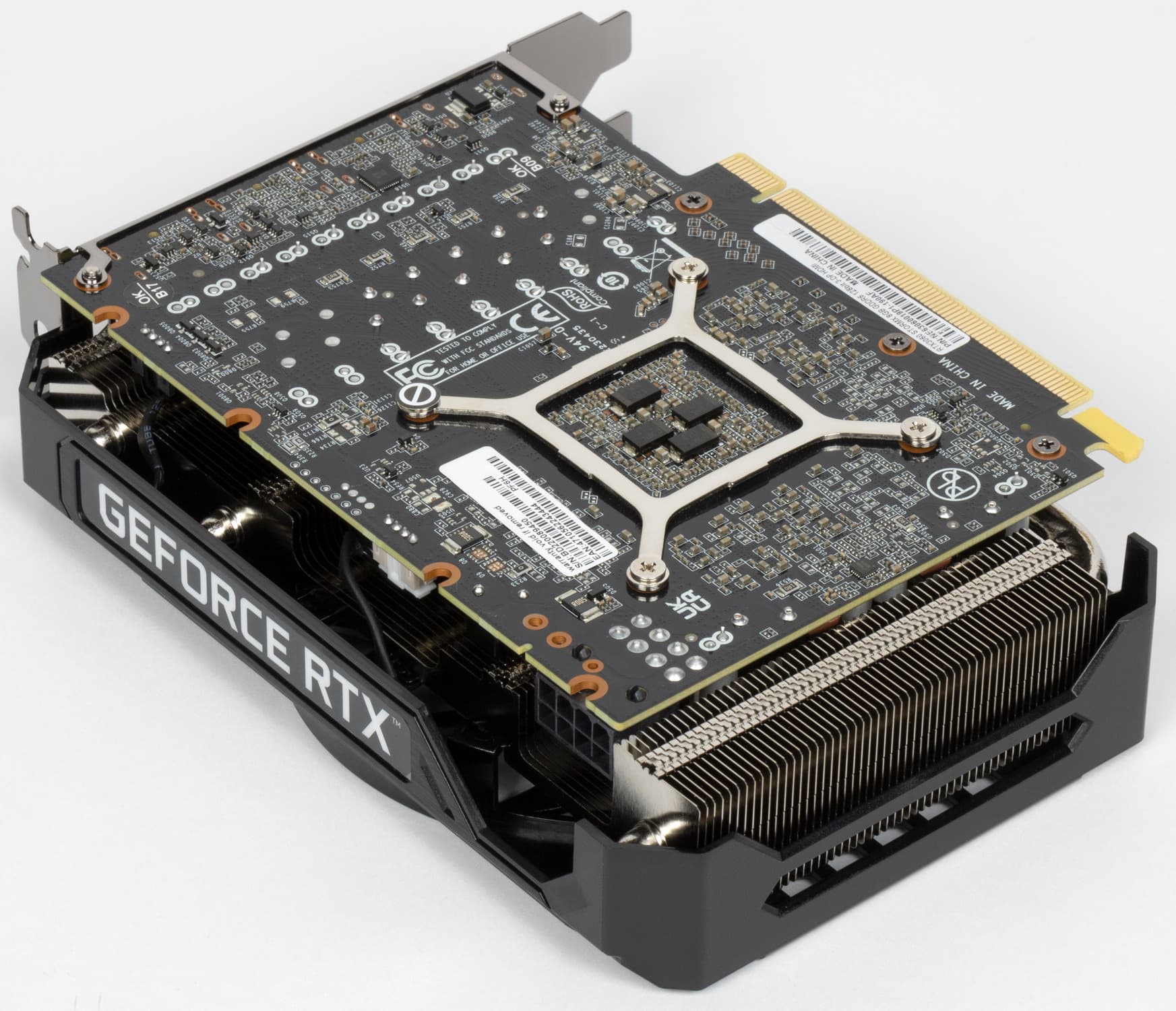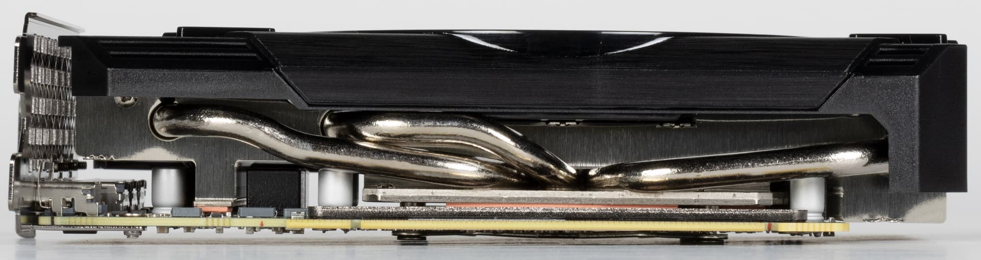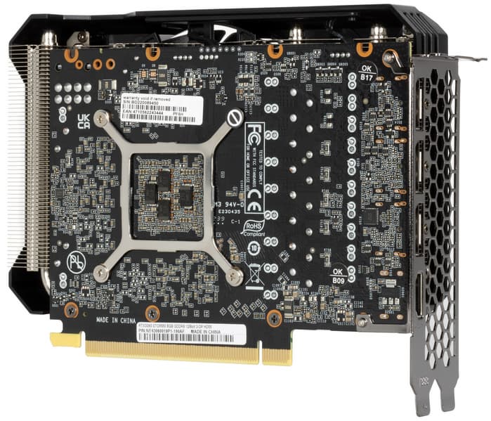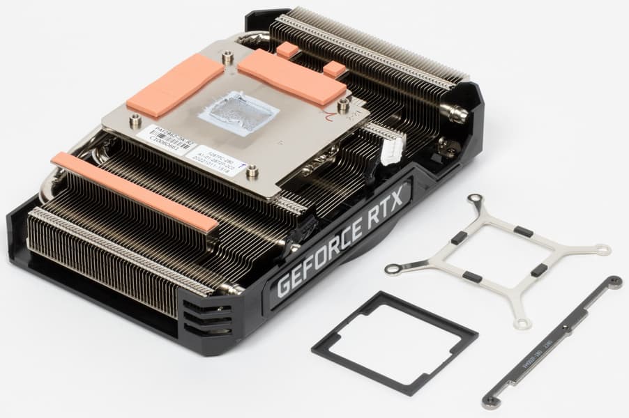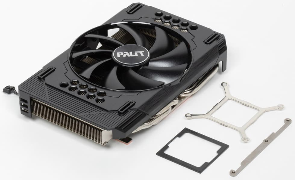 Основной пластинчатый радиатор имеет тепловые трубки, подведенные к подошве — теплосъемнику на GPU. Он же охлаждает микросхемы памяти, а для преобразователей питания VRM есть своя небольшая подошва. Компактный кулер крепится к PCB с помощью распространенного «четырехлапого» амортизатора, помогающего равномерно распределять усилие прижима. Карта не имеет задней пластины.