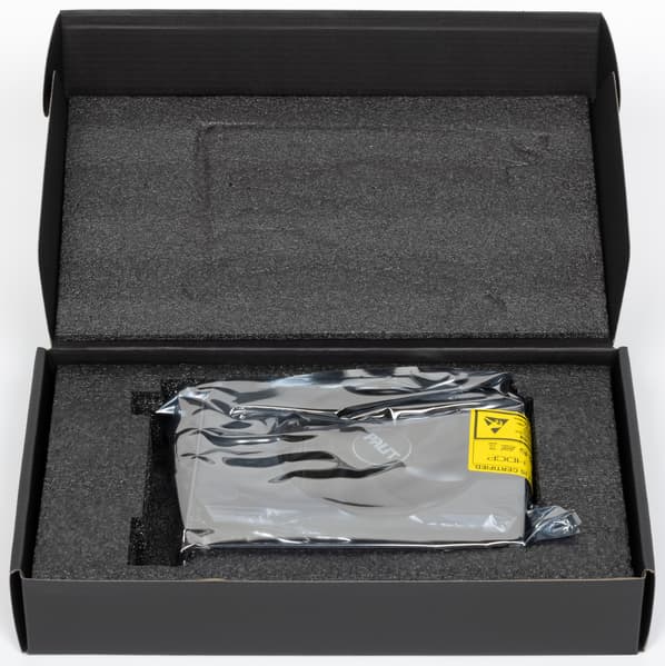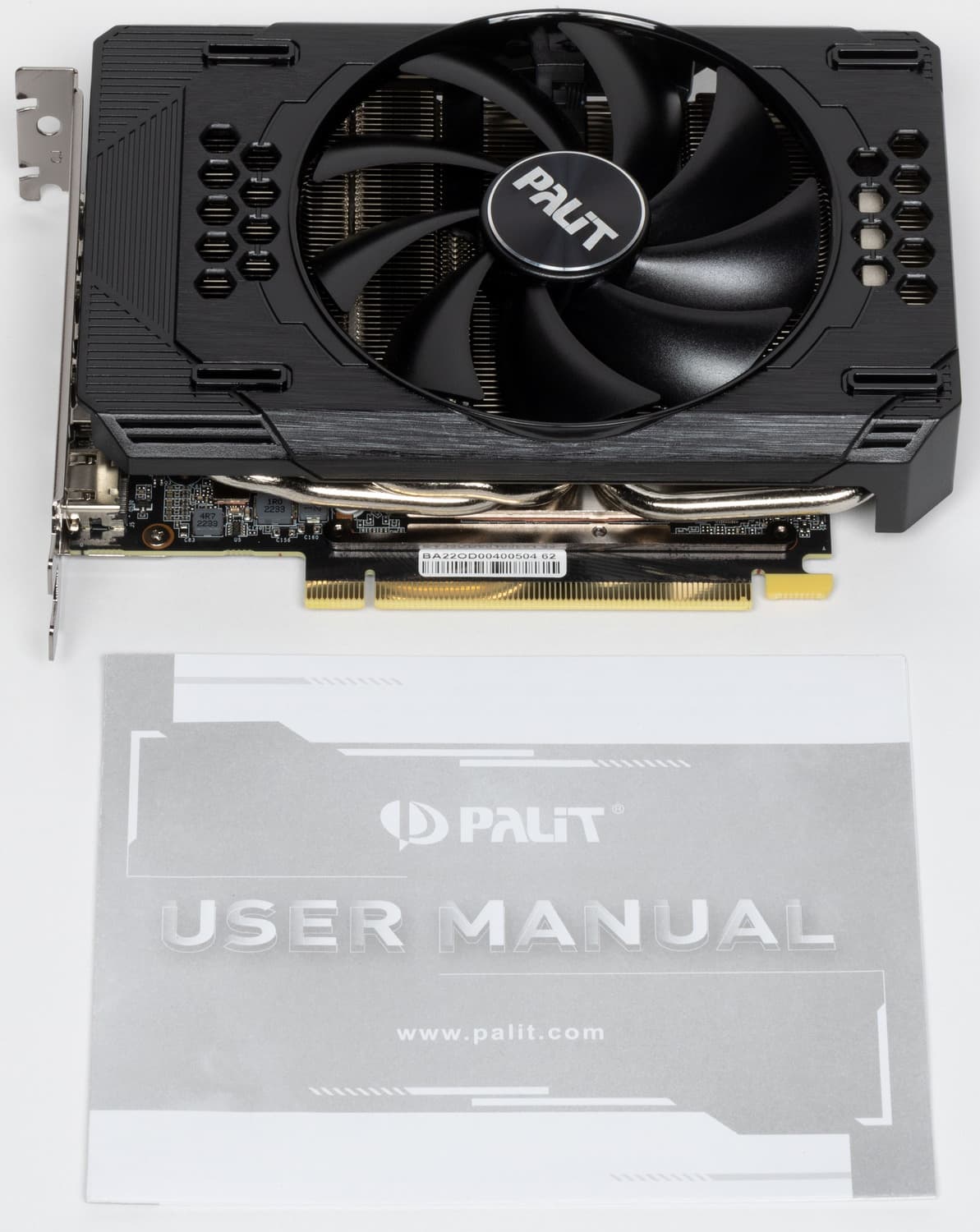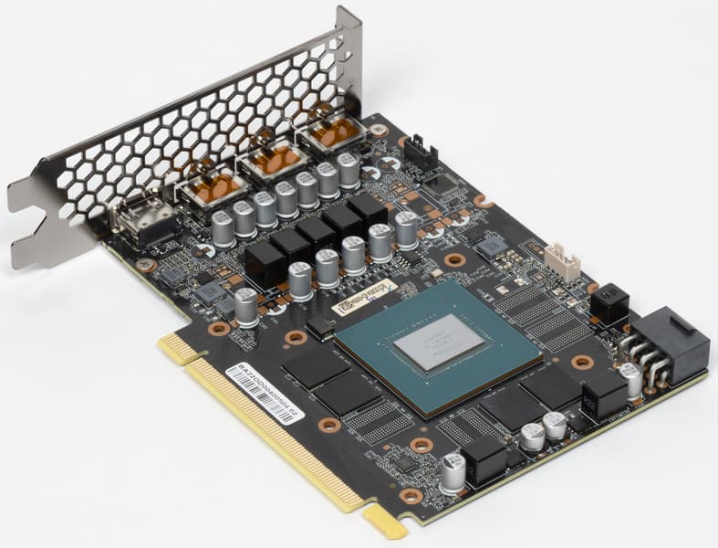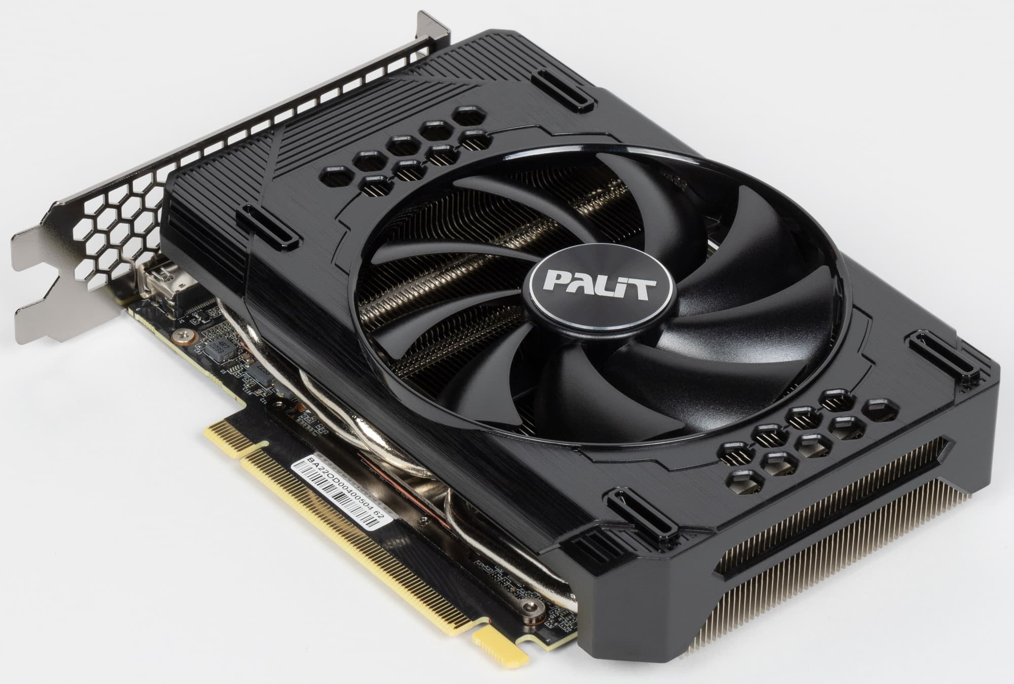 Основной пластинчатый радиатор имеет тепловые трубки, подведенные к подошве — теплосъемнику на GPU. Он же охлаждает микросхемы памяти, а для преобразователей питания VRM есть своя небольшая подошва. Компактный кулер крепится к PCB с помощью распространенного «четырехлапого» амортизатора, помогающего равномерно распределять усилие прижима. Карта не имеет задней пластины.